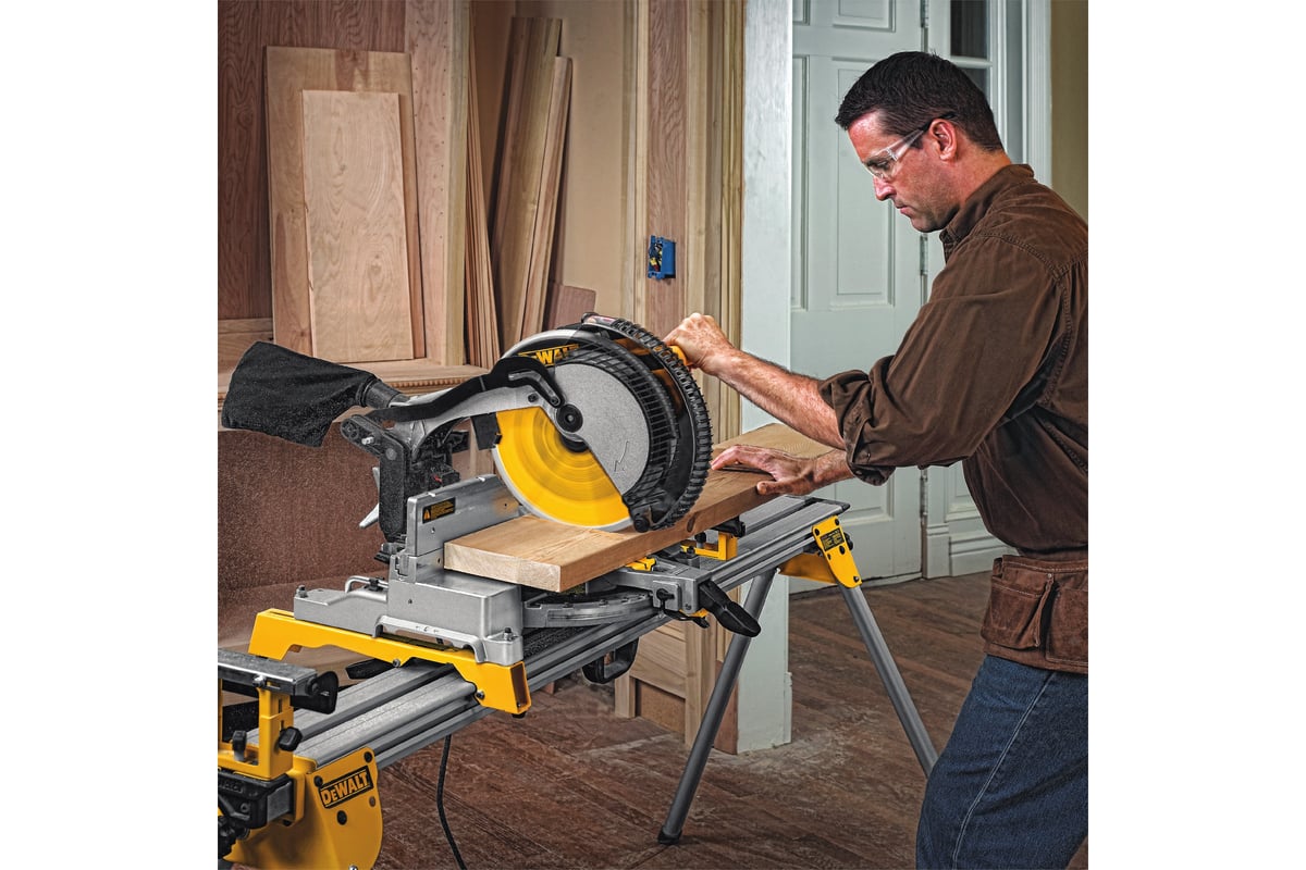 Торцовочная пила DEWALT DWS715-KS подходит для резки древесины. Пильный диск 305 мм и отсутствие механизма протяжки позволяют выполнять точные пропилы заготовок больших размеров.