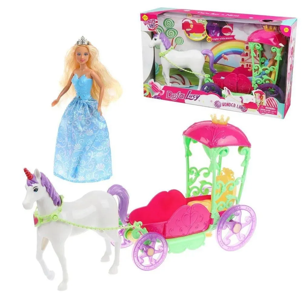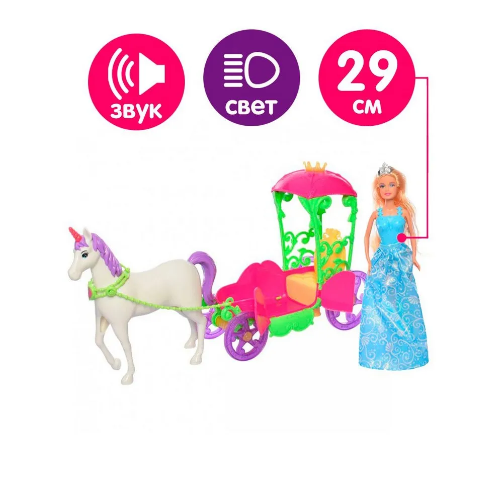 Описание товара Принцесса 29 см с каретой (свет,звук) и лошадкой-единорогом в коробке;звуки колокольчиков,мелодия