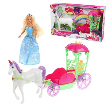 Наверное, каждая девочка любит играть в куклы. Ведь это так интересно придумывать сюжет, менять кукле наряды, придумывать причёски, собираться с подружками и играть всем вместе! Главное преимущество набора карета, оснащённая световыми и звуковыми эффектами. Внутрь кареты помещается кукла классического размера, в неё запряжен большой единорог.
