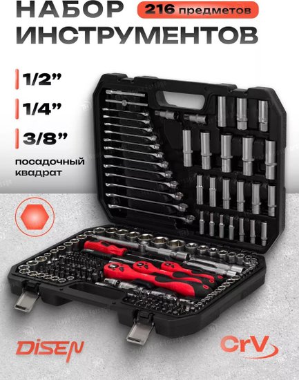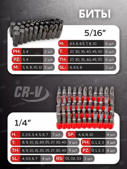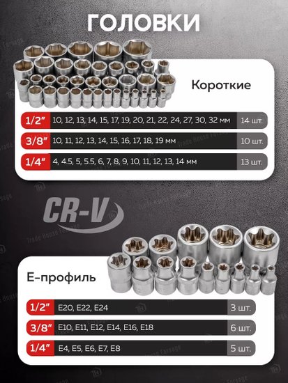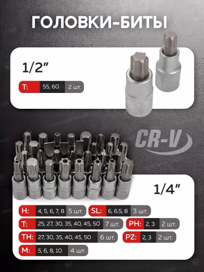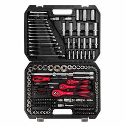 • Комплектация головки 70 шт., головки свечные 3 шт., головки-биты 30 шт., биты 75 шт., трещотка 3 шт., удлинители 5 шт., кардан шарнирный 3 шт., битодержатель 3 шт., ключи комбинированные 12 шт., рукоятка 1 шт., держатель бит магнитный 1 шт., вороток Т-образный усиленный 2 шт., ключи шестигранные Г-образные 7 шт., кейс