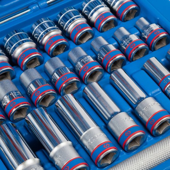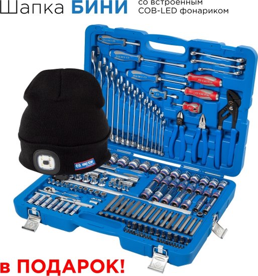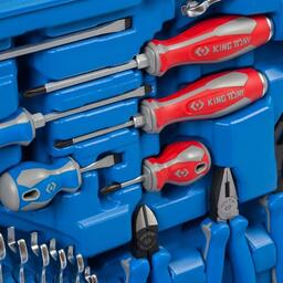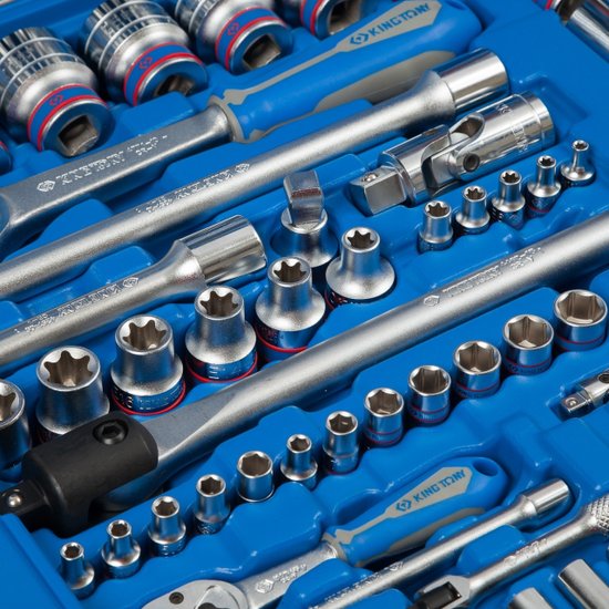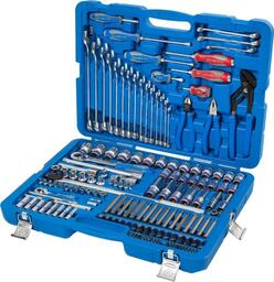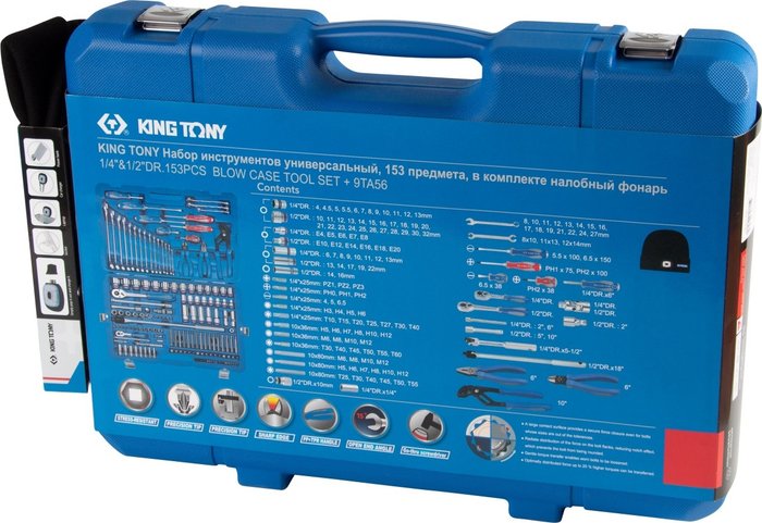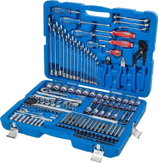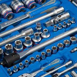 • Комплектация 1/2" и 1/4" головки и принадлежности, вставки (биты), ключи, отвертки, шарнирно-губцевый инструмент, кейс