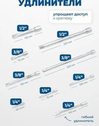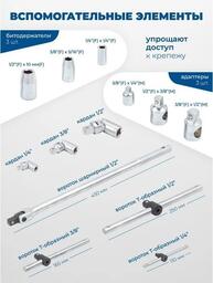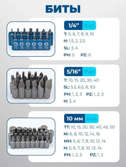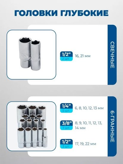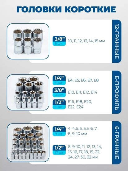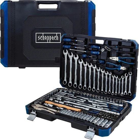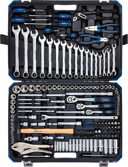 • Комплектация Головки 6 гранные 1/4": 4, 4.5, 5, 5.5, 6, 7, 8, 9, 10 мм.9 шт.; Головки 6 гранные глубокие 1/4": 6, 8, 10, 12, 13 мм.5 шт.; Головки Е-тип 1/4": E4, E5, E6, E7, E8 5 шт.; Кардан 1/4"; Биты 1/4": H1.5, H2, H2.5 mm; T5, T6, T7, T8, T9, T10; SL3, SL4 mm; PH0; PZ0 - 13 шт.; Вороток Т-образный 1/4" : 110 мм.; Гибкий удлинитель 1/4"; Трещотка 1/4"; Удлинитель 1/4": 50, 75, 100 мм. 3 шт.; Биты 5/16": H3, H4; T10, T15, T20, T30, T40; SL5.5, SL6.5, SL8, SL9.5; PH1, PH2, PH3; PZ1, PZ2, PZ3 - 17 шт.; Биты 10 мм.: Hex: 5, 6, 7, 8, 10, 12, 14 mm; Torx with hole: TT10, TT15, TT20, TT30, TT40, TT45, TT50; Phillips: PH1, PH2, PH3; Pozidriv: PZ1, PZ2; Spline: M6, M8, M10, M12, M14, M16; Spline with hole: MH5, MH6, MH7, MH8, MH10, MH12, MH14 - 32 шт.; Головки 6 гранные 3/8": 10, 11, 12, 13, 14, 15 мм. - 6 шт.; Головки 6 гранныеглубокие 3/8": 8, 9, 10, 11, 12, 13, 14 мм. - 7 шт.; Головки Е-тип 3/8": E10, E11, E12, E14 - 4 шт.; Трещотка 3/8"; Вороток Т-образный 3/8": 165 мм.; Кардан 3/8"; 3x 3/8" Extension Bar: 75, 150, 250 мм. 3 шт.; Головки 6 гранные 1/2": 8, 9, 10, 11, 12, 13, 14, 15, 16, 17, 18, 19, 22, 24, 27, 30, 32 мм.17 шт.; Головки глубокие 6 гранные 1/2": 17, 19, 22 мм.; Трещотка 1/2 72T; Удлинитель 1/2": 125, 250 mm 2 шт.; Кардан 1/2"; Головки Е-тип 1/2": E16, E18, E20, E22, E24 5 шт.; Удлинитель 1/2" : 250 мм.; Гибкий удлинитель 1/2" : 430 мм.; Головки свечные 1/2": 16, 21 мм. - 2 шт.; Адаптеры 1/2": 3/8"(F)x1/4"(M), 3/8"(F)x1/2"(M), 1/2"(F)x3/8"(M) - 3 шт.; Битодержатели: 1/4"(F)x1/4"(F), 3/8"(F)x5/16"(F), 1/2"(F)x10 mm(F) - 3 шт; Ключи комбинированные: 8, 10, 11, 12, 13, 14, 15, 16, 17, 18,19, 21, 22, 24 мм.14 шт.; Ключи разрезные: 8x10, 11x13, 12x14 мм. 3 шт.; Отвертки: PH 2x38 mm, PH 2x100 мм, PH 1x75 мм.; SL 5.5x125 мм, SL 6x38 мм, SL 6.5x150 мм. 6 шт.; Магнит телескопический: 130-640 мм.; Зажим гейферный 225 мм.; Клещи переставные: 250 мм.; Комбинированные пассатижи 175 мм.;Бокорезы 150 мм.;Молоток 300 гр.;Пластиковый кейс.