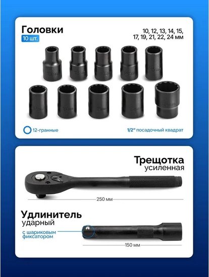 • Комплектация трещотка (1 шт.), головки (10 шт.), удлинитель (1 шт.), кейс (1 шт.)