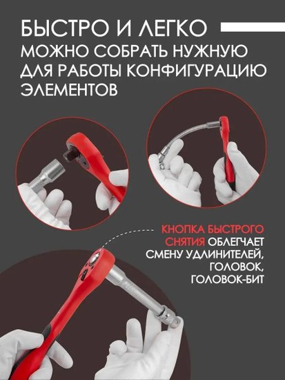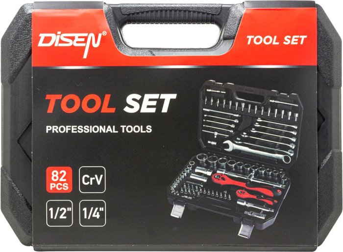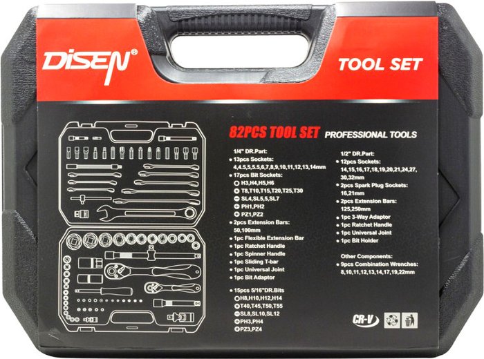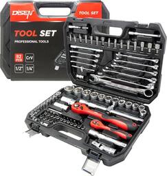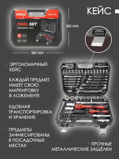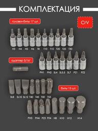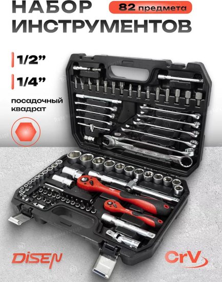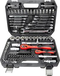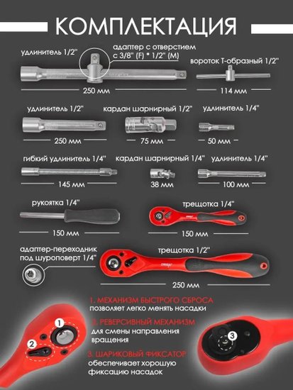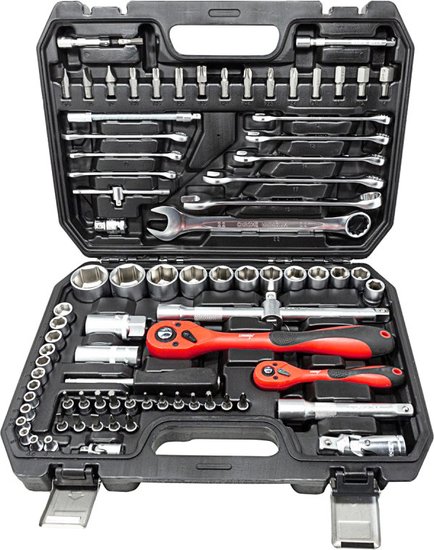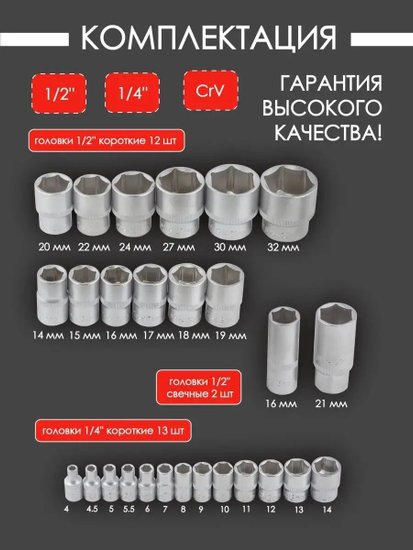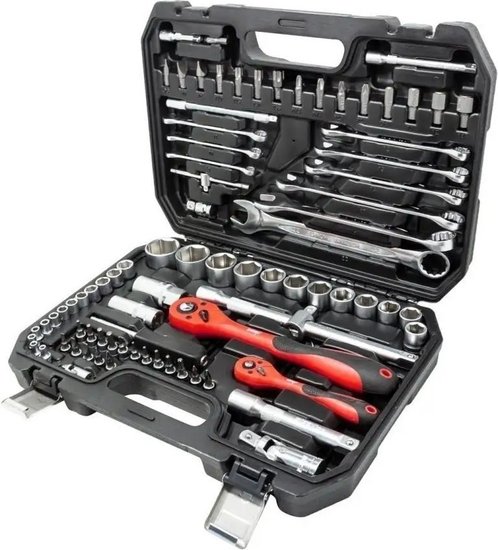 • Комплектация головки торцевые 1/2" короткие (14, 15, 16, 17, 18, 19, 20, 22, 24, 27, 30, 32 мм), головки торцевые 1/4" короткие (4, 4.5, 5, 5.5, 6, 7, 8, 9, 10, 11, 12, 14, 15 мм), свечные головки 2 шт., вороток Т-образный 1 шт., головки-биты 17 шт., биты 15 шт., трещотка 2 шт., рукоятка 1 шт., адаптеры 3 шт., ключи комбинированные 9 шт., удлинители 4 шт., гибкий удлинитель 1 шт., карданы 2 шт., кейс.