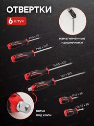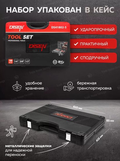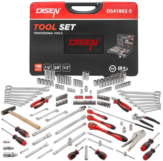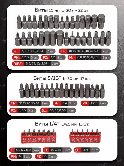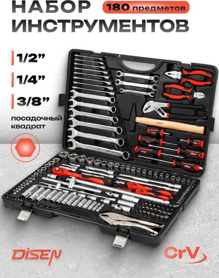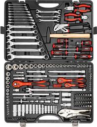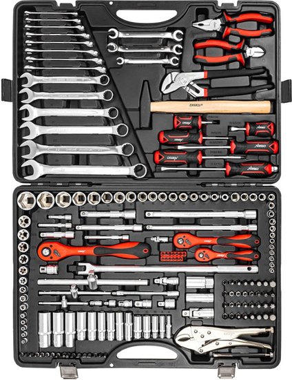 • Комплектация головки 61 шт., биты 62 шт., трещотка 3 шт., вороток Т-обр. 3 шт., удлинители 8 шт., гибкий удлинитель, кардан шарнирный 3 шт., головки свечные 2 шт., вороток шарнирный, адаптер 3 шт., битодержатель 3 шт., ключи разрезные 3 шт., ключи комбинированные 14 шт., отвертки крестовые 3 шт., отвертки шлицевые 3 шт., магнит телескопический, плоскогубцы, пассатижи, бокорезы, захват грейферный, молоток, кейс.