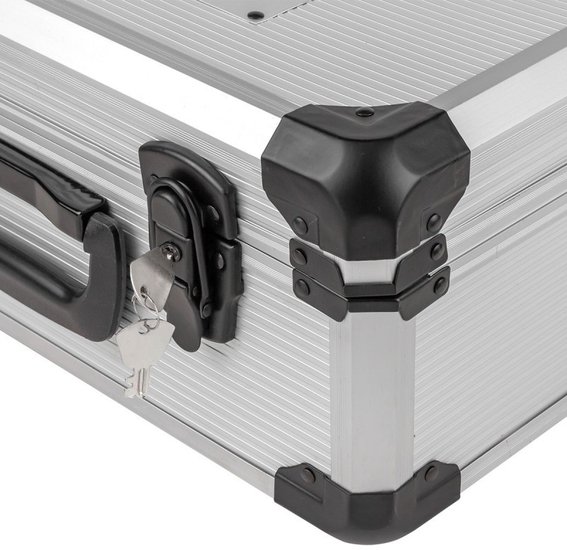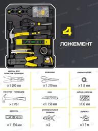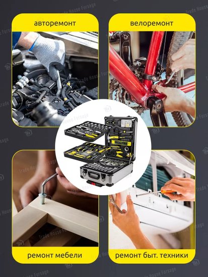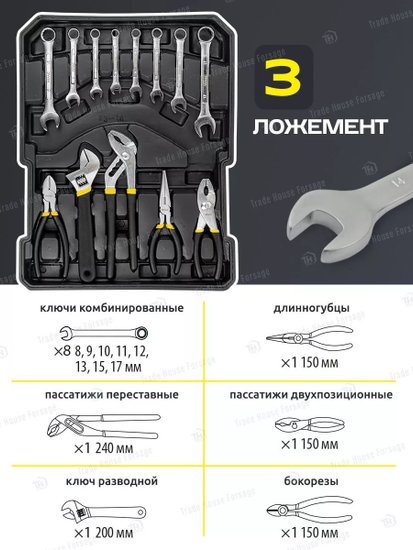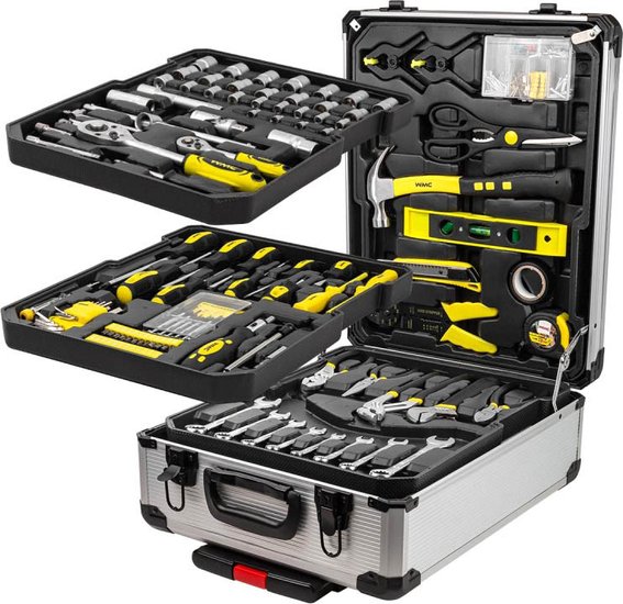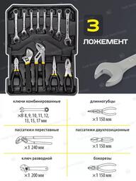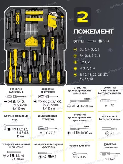 • Комплектация трещотки 1/2" и 1/4", карданы, Т-образные воротки, свечные головки, удлинители 1/2" и 1/4", отвертки SL, PH, диэлектрические отвертки, Г-образные шестигранные ключи, тестер для шин, магнитные битодержатели, биты SL, PH, PZ, H, T, комбинированные ключи, пассатижи, длинногубцы, бокорезы, щипцы для зачистки проводов, ножницы, изолента, молоток-гвоздёр, набор крепежа, уровень, универсальные зажимы, рулетка, нож и прочный пластиковый кейс.