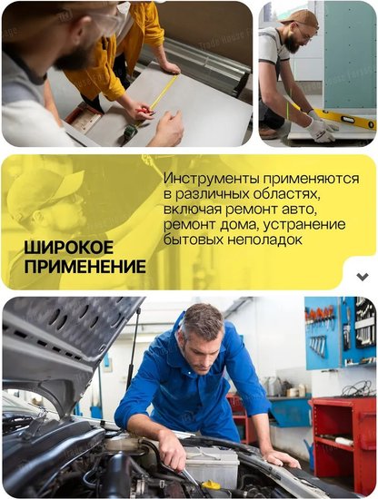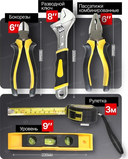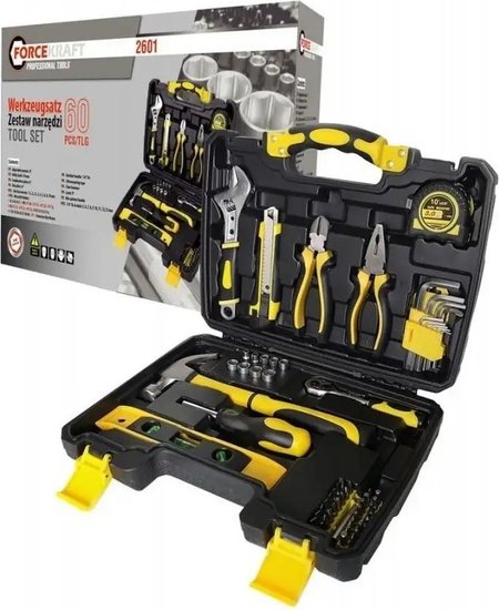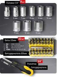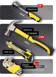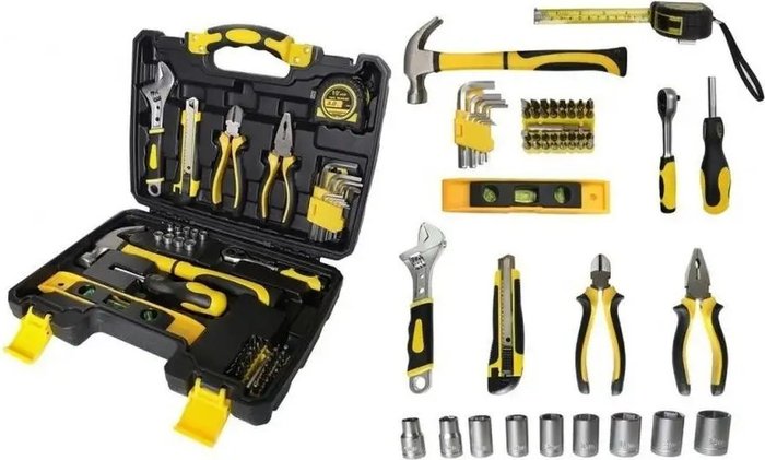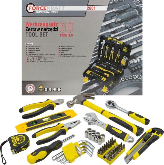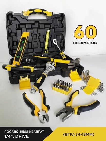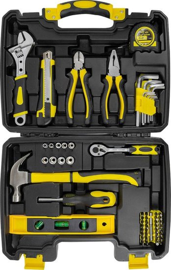 • Комплектация кусачки (1 шт.), пассатижи (1 шт.), молоток (1 шт.), нож (1 шт.), трещотка (1/4"), отвертка под биты (1 шт., 1/4"), рулетка (1 шт.), кейс