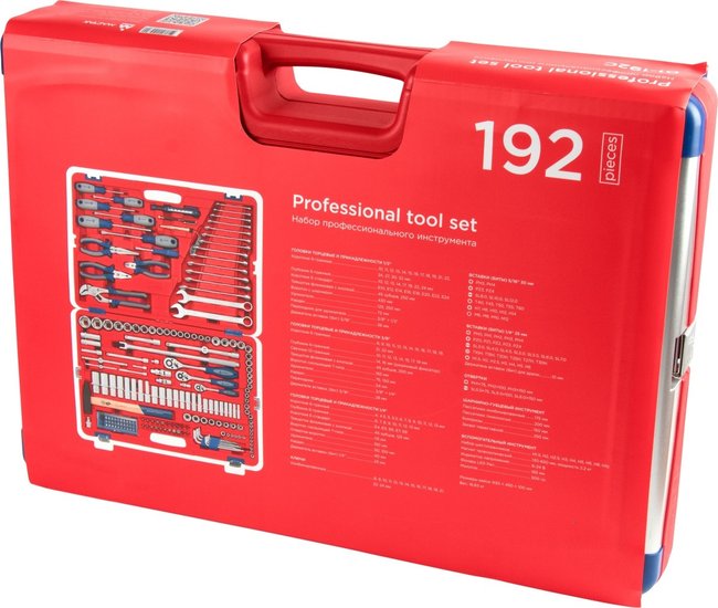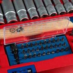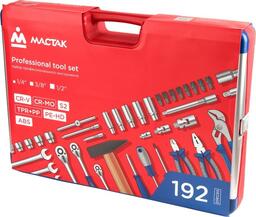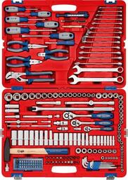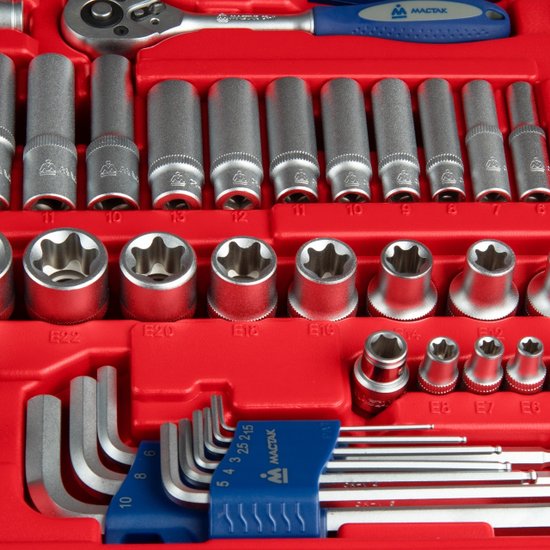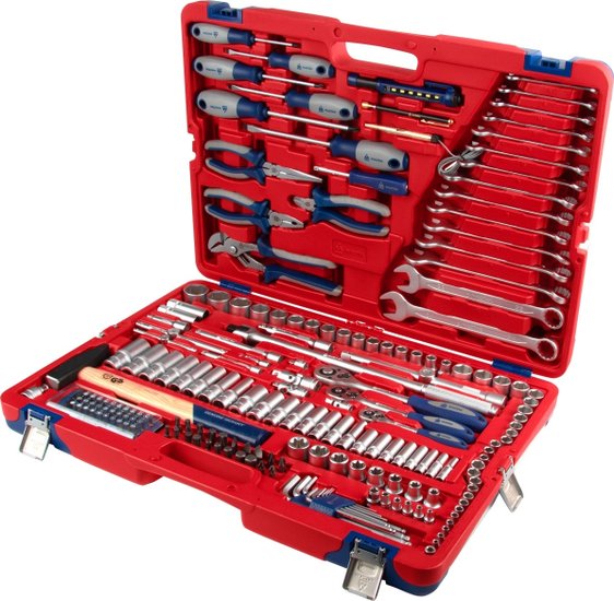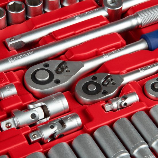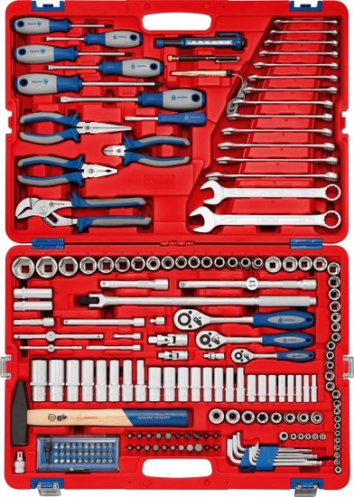 • Комплектация Головки и принадлежности 1/2", 3/8", 1/4"; Вставки (биты) 5/16", 1/4"; Ключи; Отвёртки; Шарнирно-губцевый инструмент; Вспомогательный инструмент; Кейс