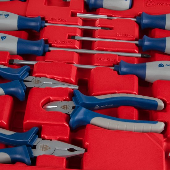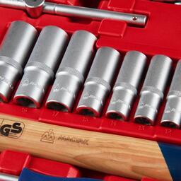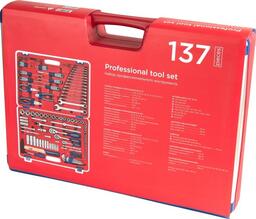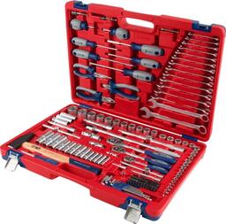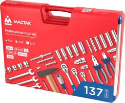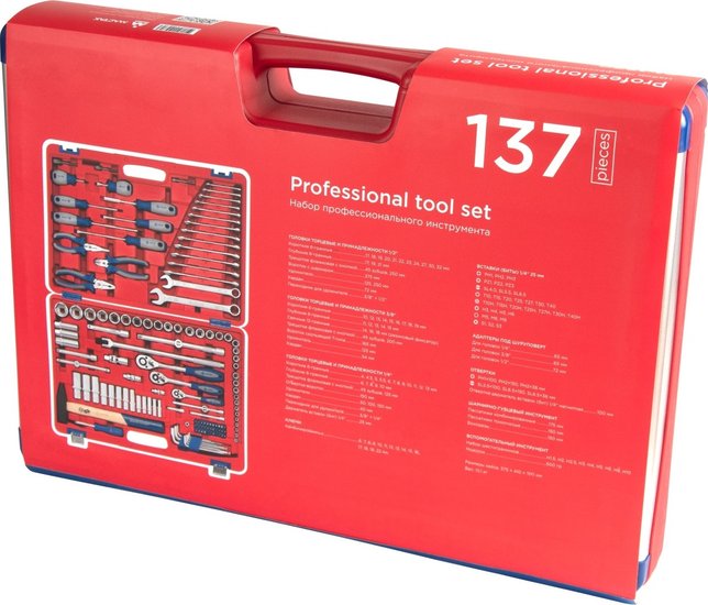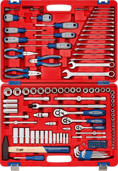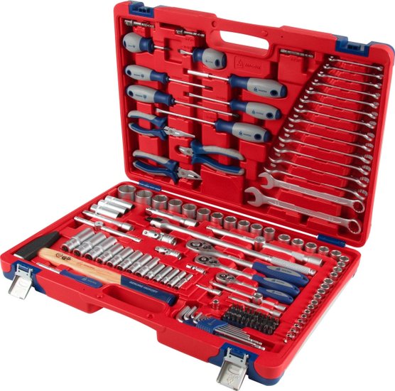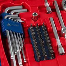 • Комплектация Головки и принадлежности 1/2", 3/8", 1/4"; Вставки (биты) 1/4" 25 мм; Адаптеры под шуруповёрт; Ключи; Отвёртки; Шарнирно-губцевый инструмент; Вспомогательный инструмент; Кейс