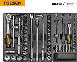 • Комплектация Набор инструментов "BOXER" в черной тележке, 157 предметов, включает головки, ключи, отвертки, пассатижи, выколотки и другие инструменты.