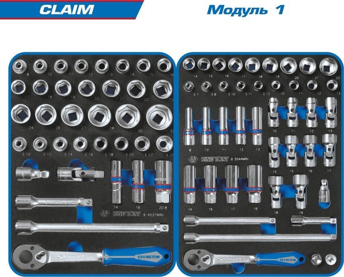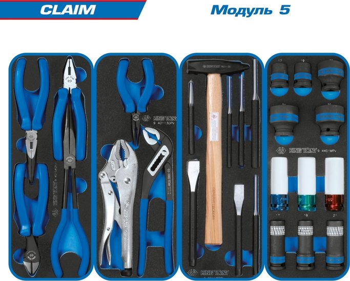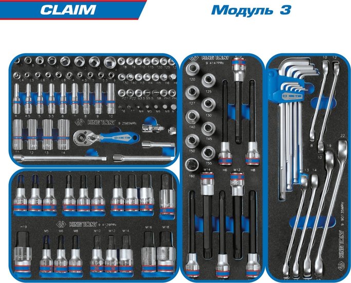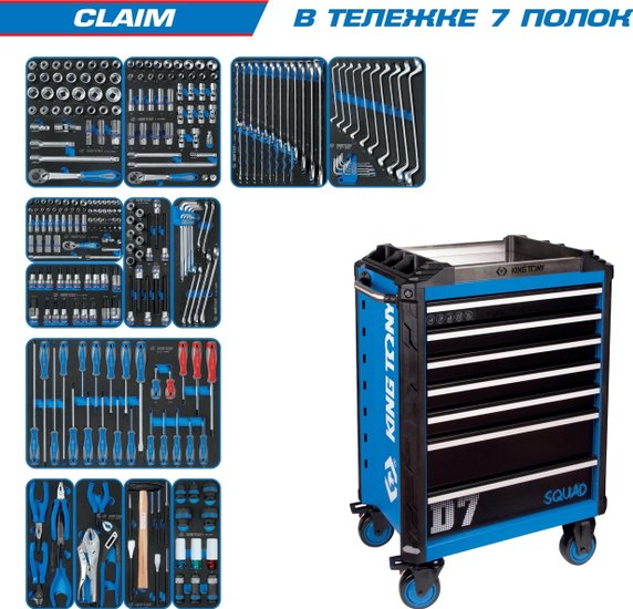 • Комплектация Набор инструментов "CLAIM" в синей тележке, 286 предметов, включает торцевые головки, ключи, отвертки, пассатижи и другие инструменты.