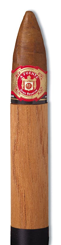 A slightly misshapen torpedo with a gleaming wrapper. The cigar forms a flaky ash as it burns and imparts a woody, gummy smoke.