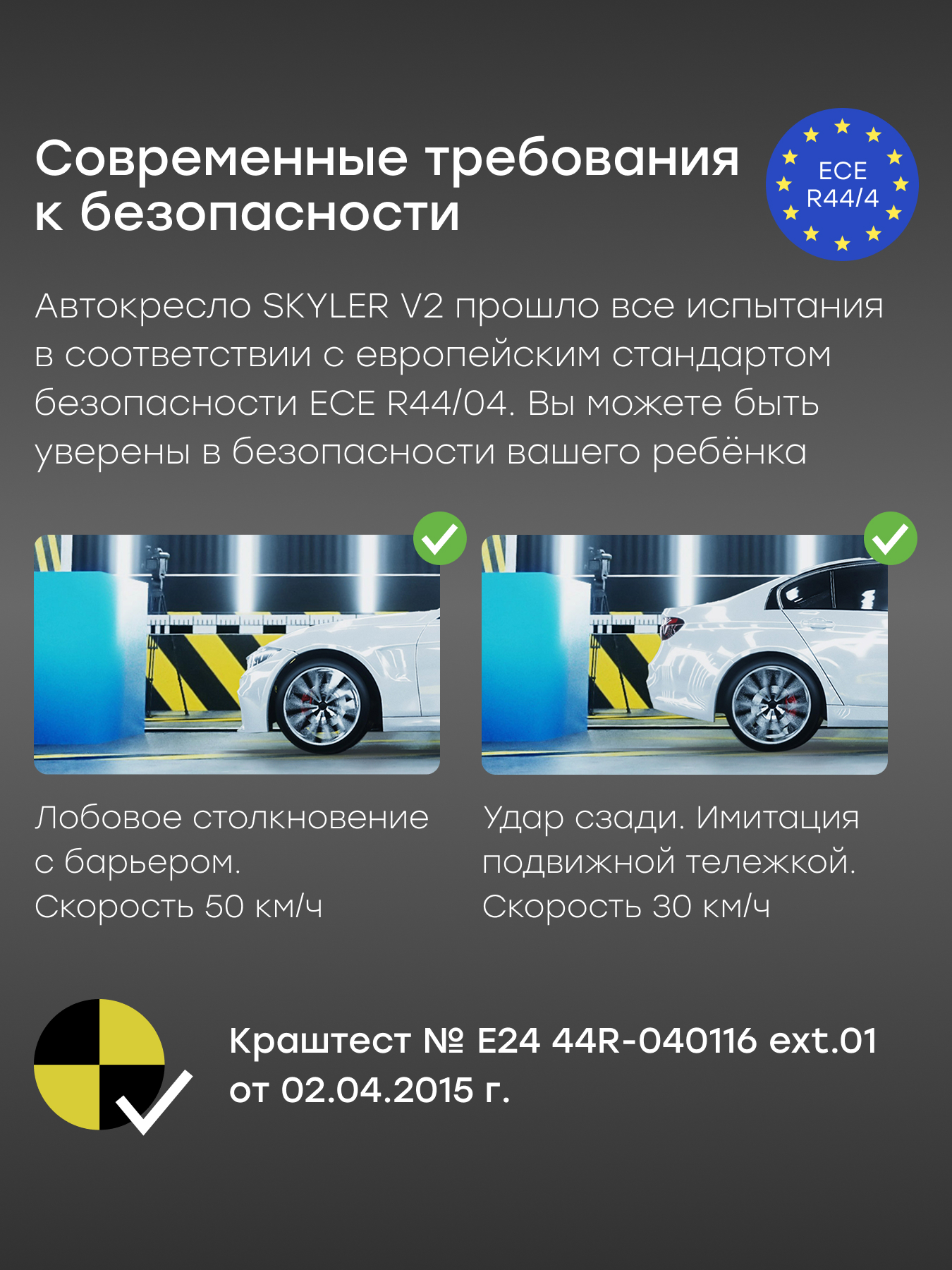 • Подтверждённая безопасность — автокресло прошло обязательные краш-тесты (номер краштеста: № E24 44R-040116 ext.01 от 02.04.2015 года) при сертификации (сертификат безопасности детских кресел ECE R44/04)