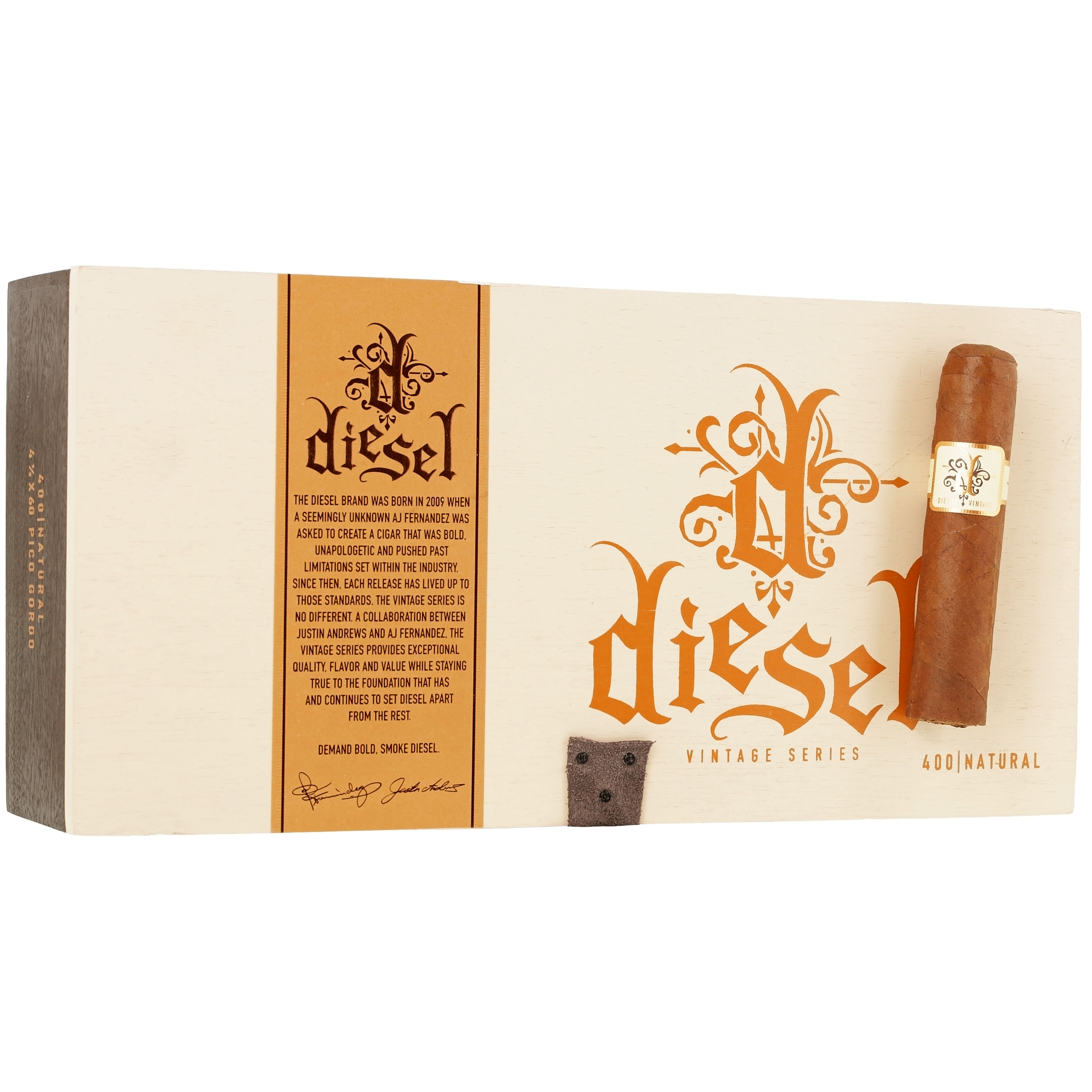 A bold and flavorful smoke with a spicy, coffee, and earthy profile underscored by a deep creaminess. Its warm brown Ecuadorian wrapper covers a Nicaraguan Habano binder and vintage filler leaves from Nicaragua, which have been aged for five years prior to rolling. The Diesel Vintage Series Natural cigar easily balances boldness with complexity to create a uniquely satisfying smoking experience. The cigars are handmade at the Tabacalera AJ Fernandez Cigars de Nicaragua S.A.