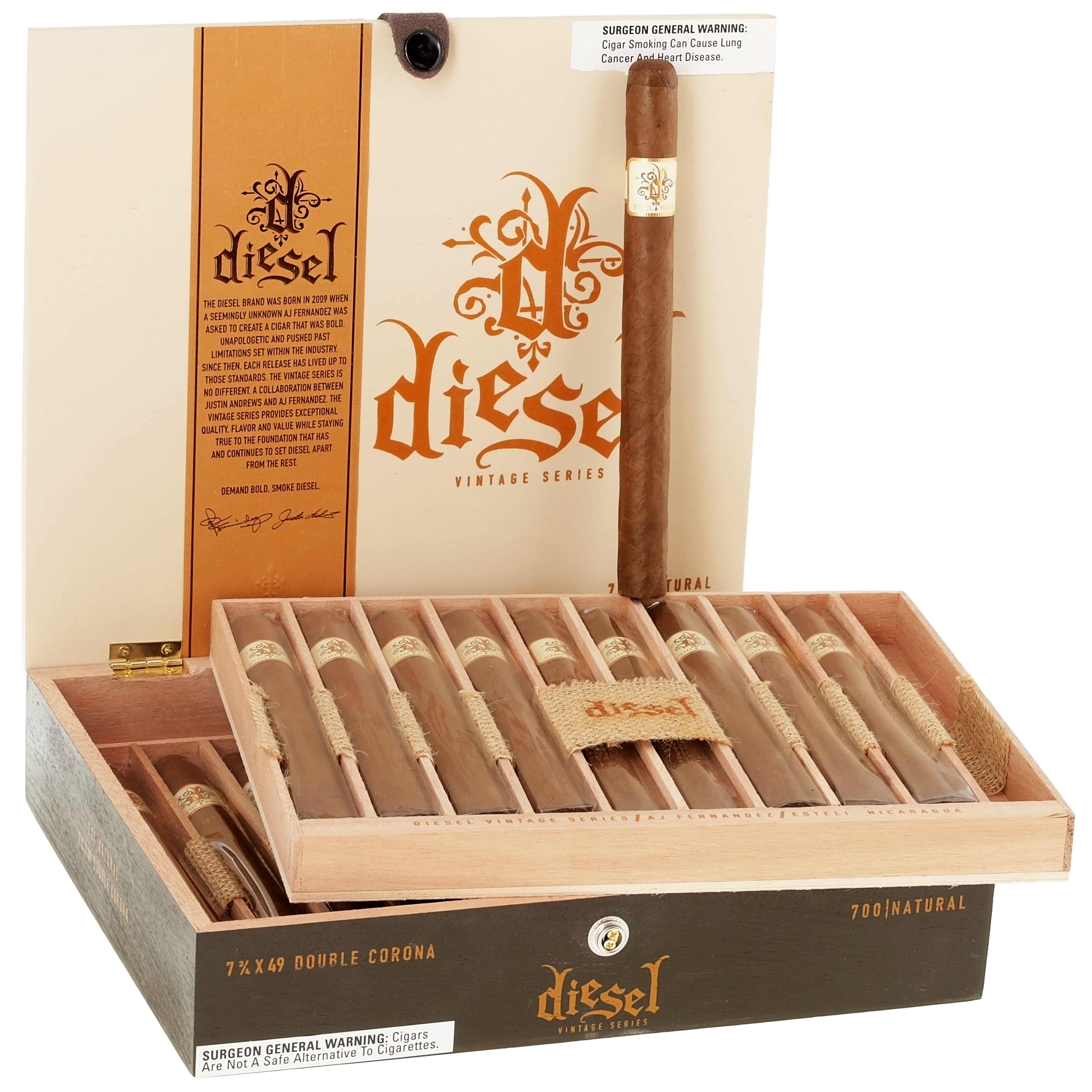 A bold and flavorful smoke with a spicy, coffee, and earthy profile underscored by a deep creaminess. Its warm brown Ecuadorian wrapper covers a Nicaraguan Habano binder and vintage filler leaves from Nicaragua, which have been aged for five years prior to rolling. The Diesel Vintage Series Natural cigar easily balances boldness with complexity to create a uniquely satisfying smoking experience. The cigars are handmade at the Tabacalera AJ Fernandez Cigars de Nicaragua S.A.