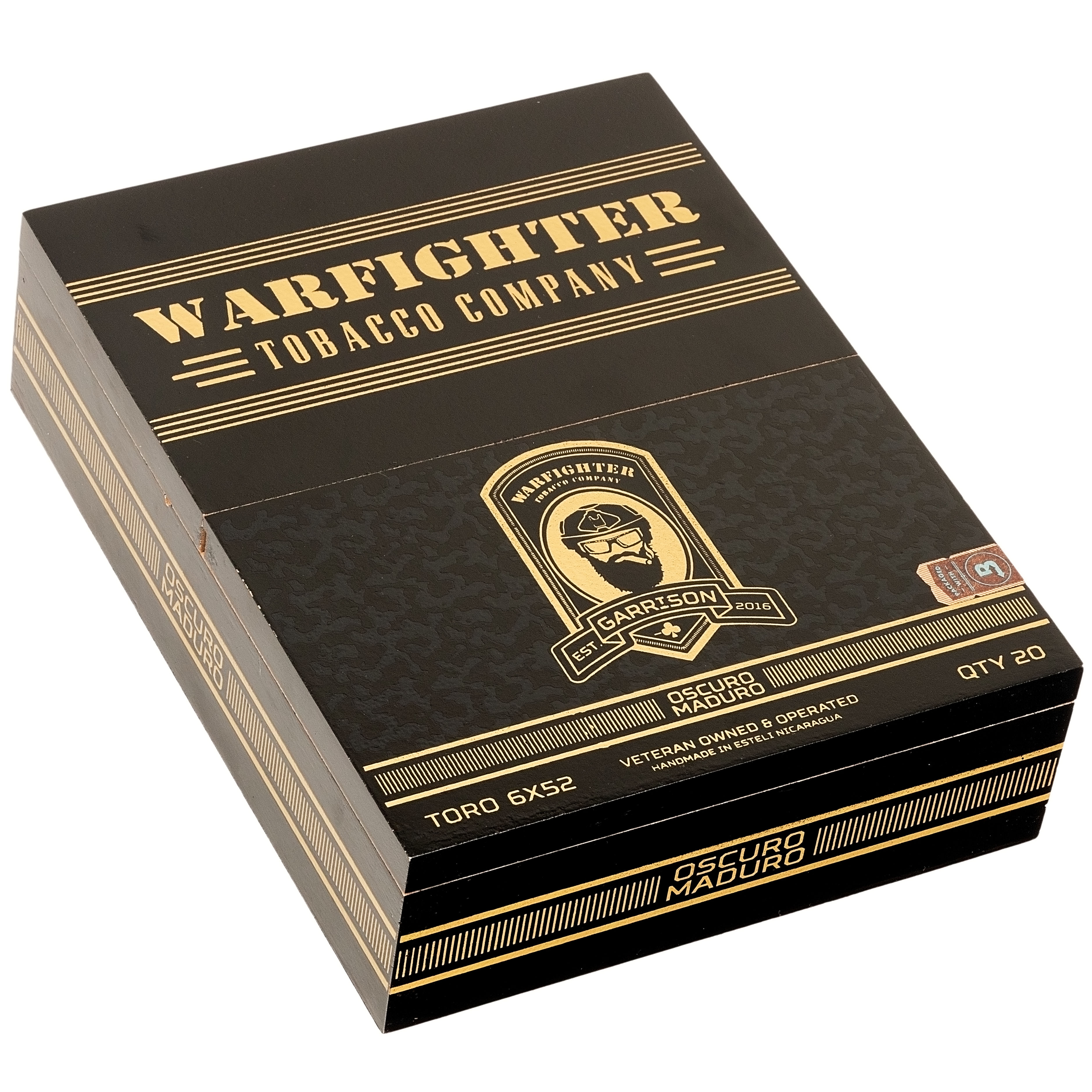 The Warfighter .50 Cal Garrison Oscuro Maduro Toro is a medium to full bodied stick that was made with veteran cigar aficionados in mind, but novices will want to try it as a step-up cigar. Its muscular, dark chocolatey Honduran Habano oscuro maduro wrapper sheaths a Honduran Connecticut binder and a filler packed with Habano tobacco from three of Nicaragua’s top tobacco producing regions: Ometepe, Esteli, and Condega. This bold but manageable blend delivers a lively smoking experience with notes of earth and leather and accented with not-so-subtle hints of spice and pepper. The Warfighter .50 Cal Garrison Oscuro Maduro is handmade at the Plasencia cigar factory in Nicaragua.