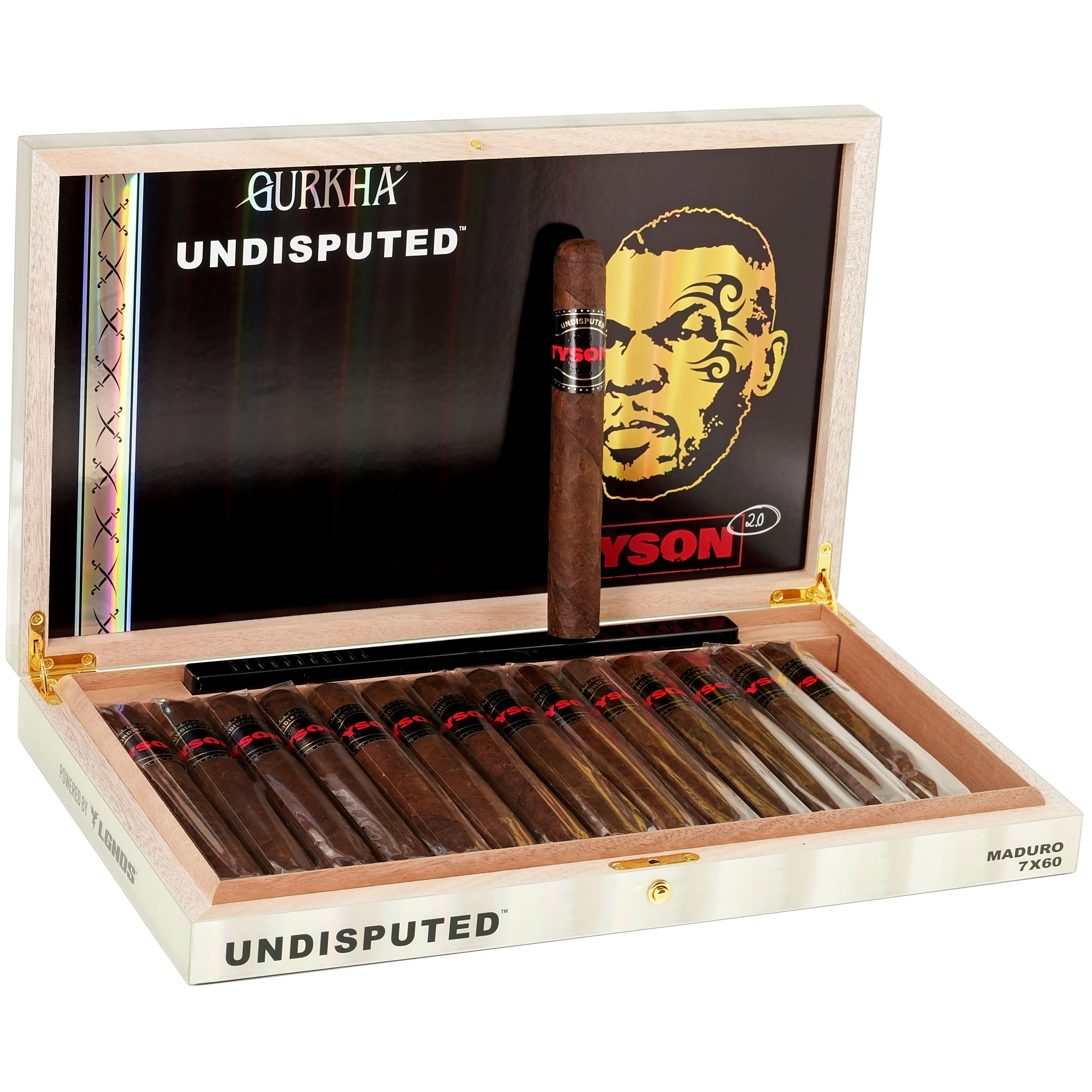 A medium-bodied smoke that delivers a winning combination of sweetness, dark chocolate, and peppery notes. Its delicious Mexican San Andres maduro wrapper covers a Cameroon binder and USA Broadleaf Corojo long-filler leaves. The Gurkha Tyson 2.0 Undisputed Maduro cigars are expertly handmade by the El Artista cigar factory in the Dominican Republic.