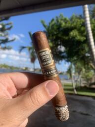 A full-bodied smoke with an earthy and salty profile accented with hints of coffee, cocoa, and pepper. Its Ecuadorian Habano wrapper covers an Ecuadorian Sumatra binder and filler leaves from Nicaragua and the Dominican Republic. The cigars are handmade in the USA at the historic El Titan de Bronze factory, which is in Miami, Florida. The blend for the Herrera Esteli Miami was developed by Drew Estate master blender Willie Herrera.