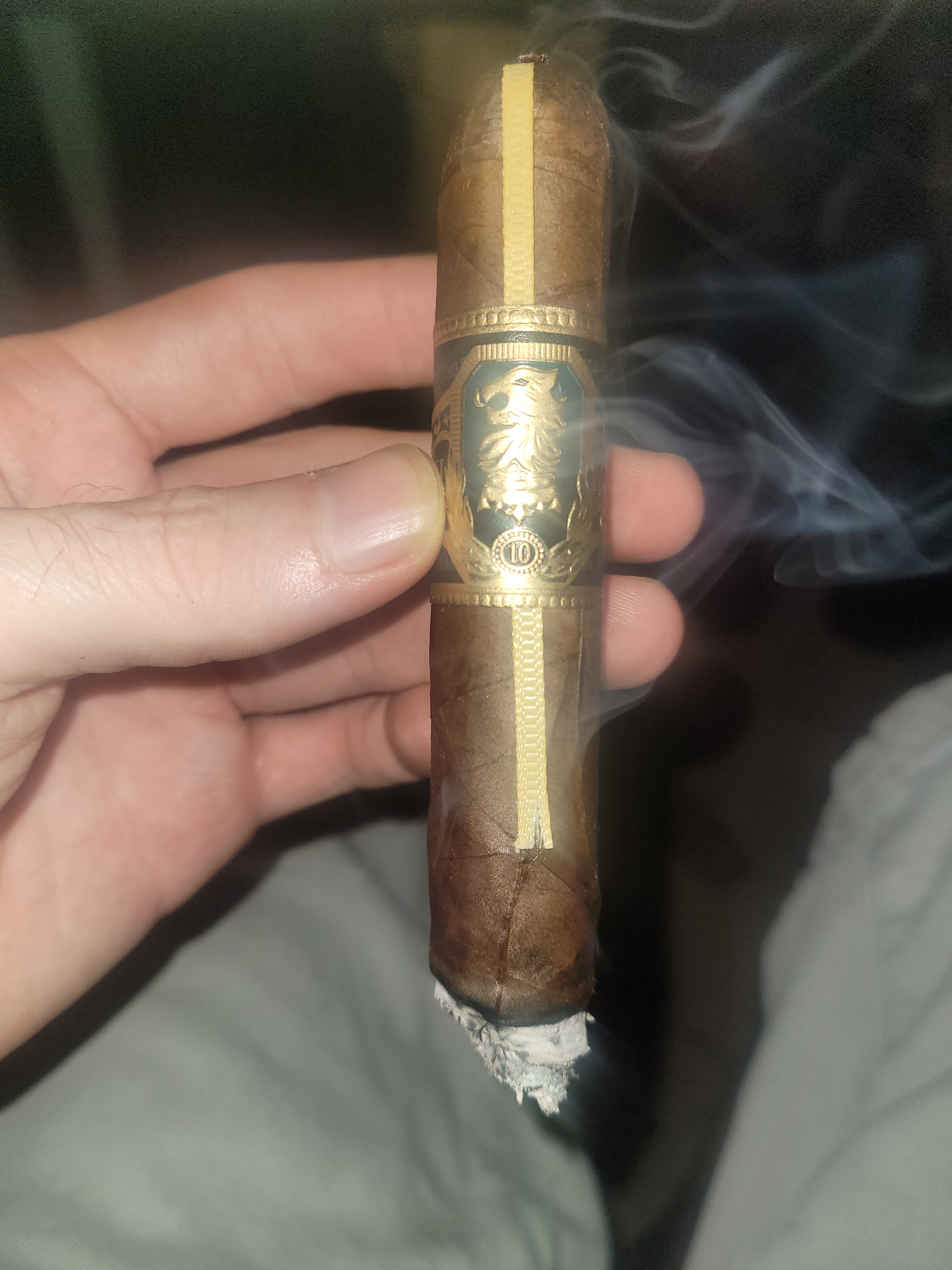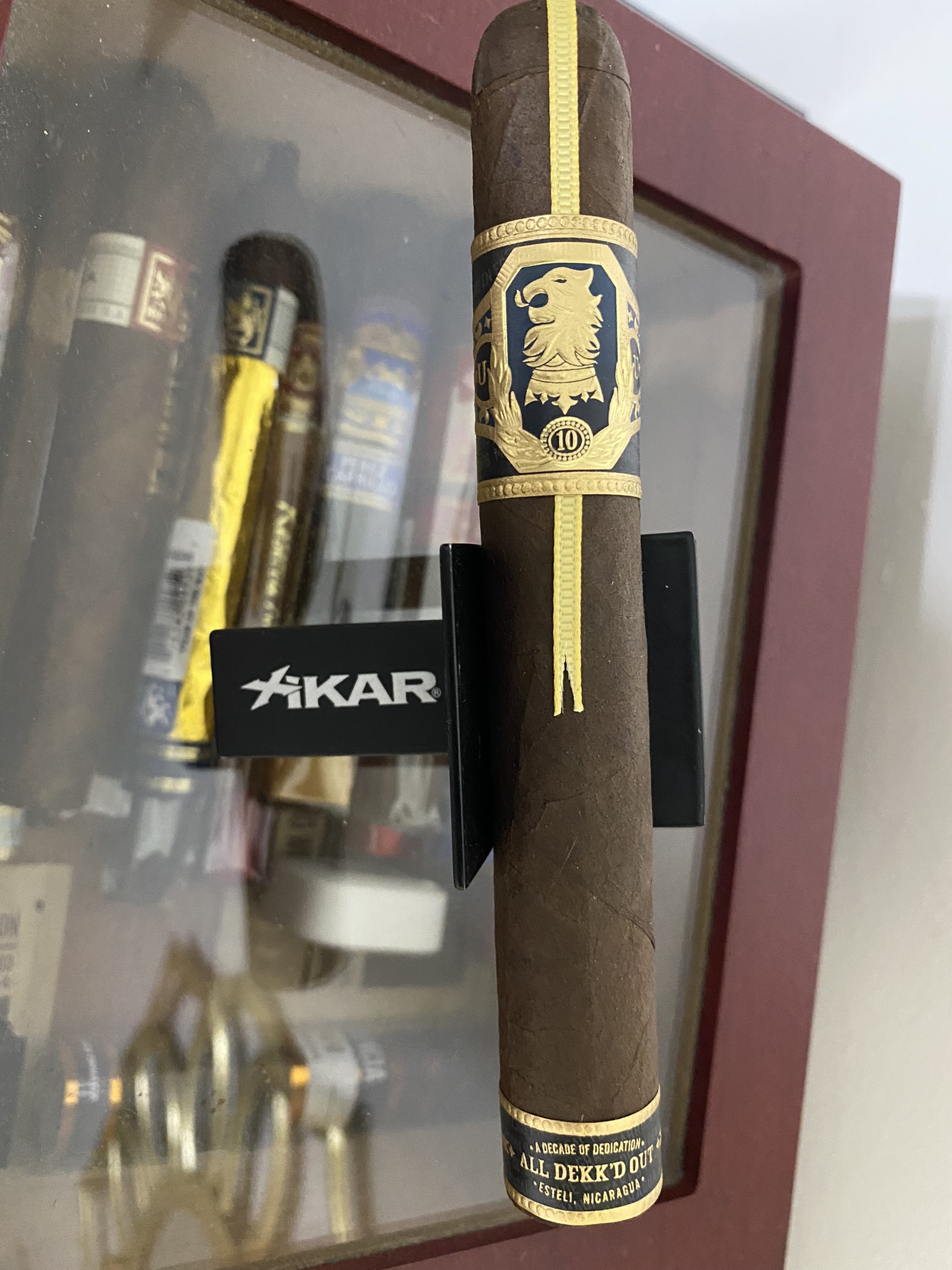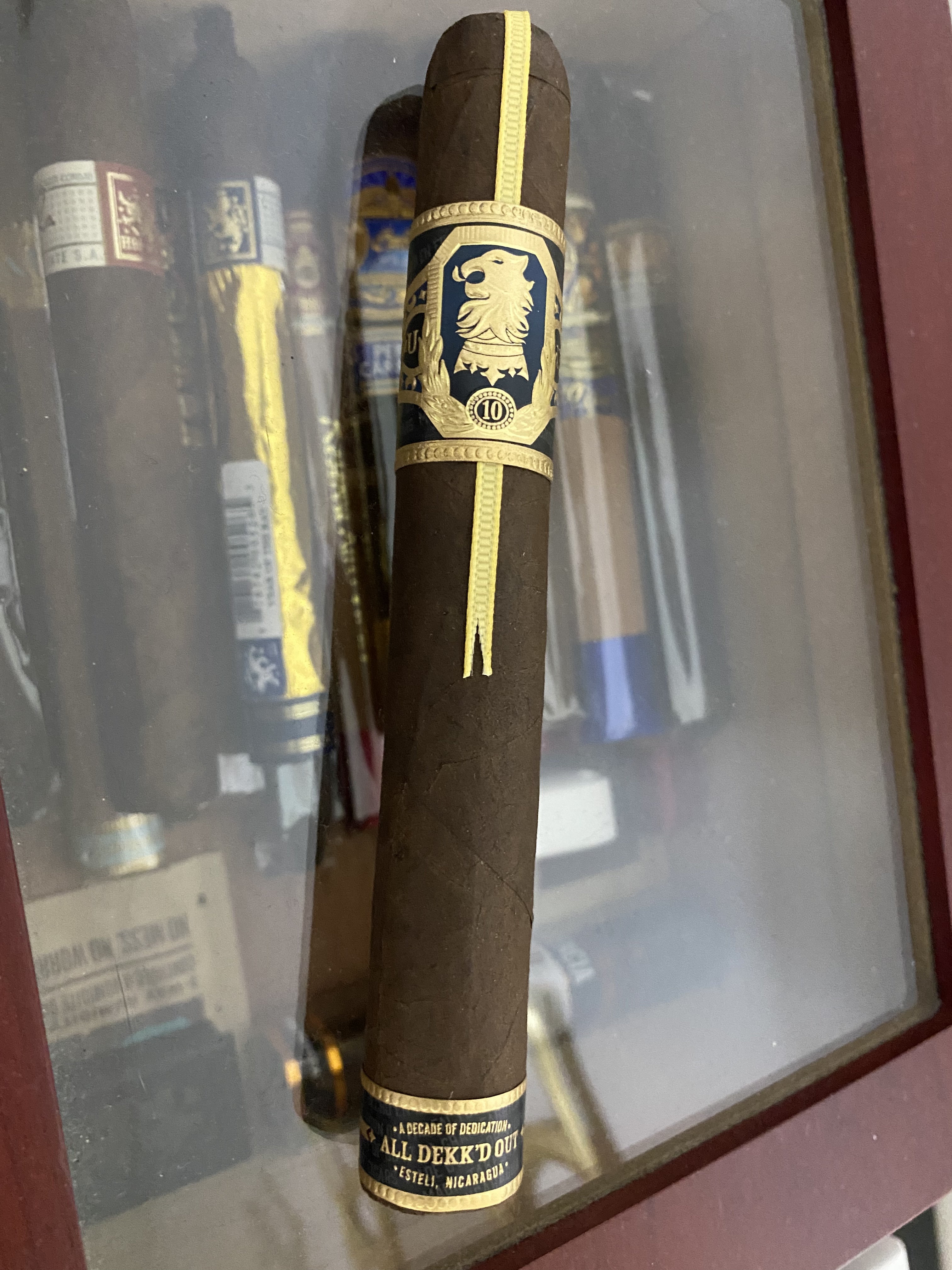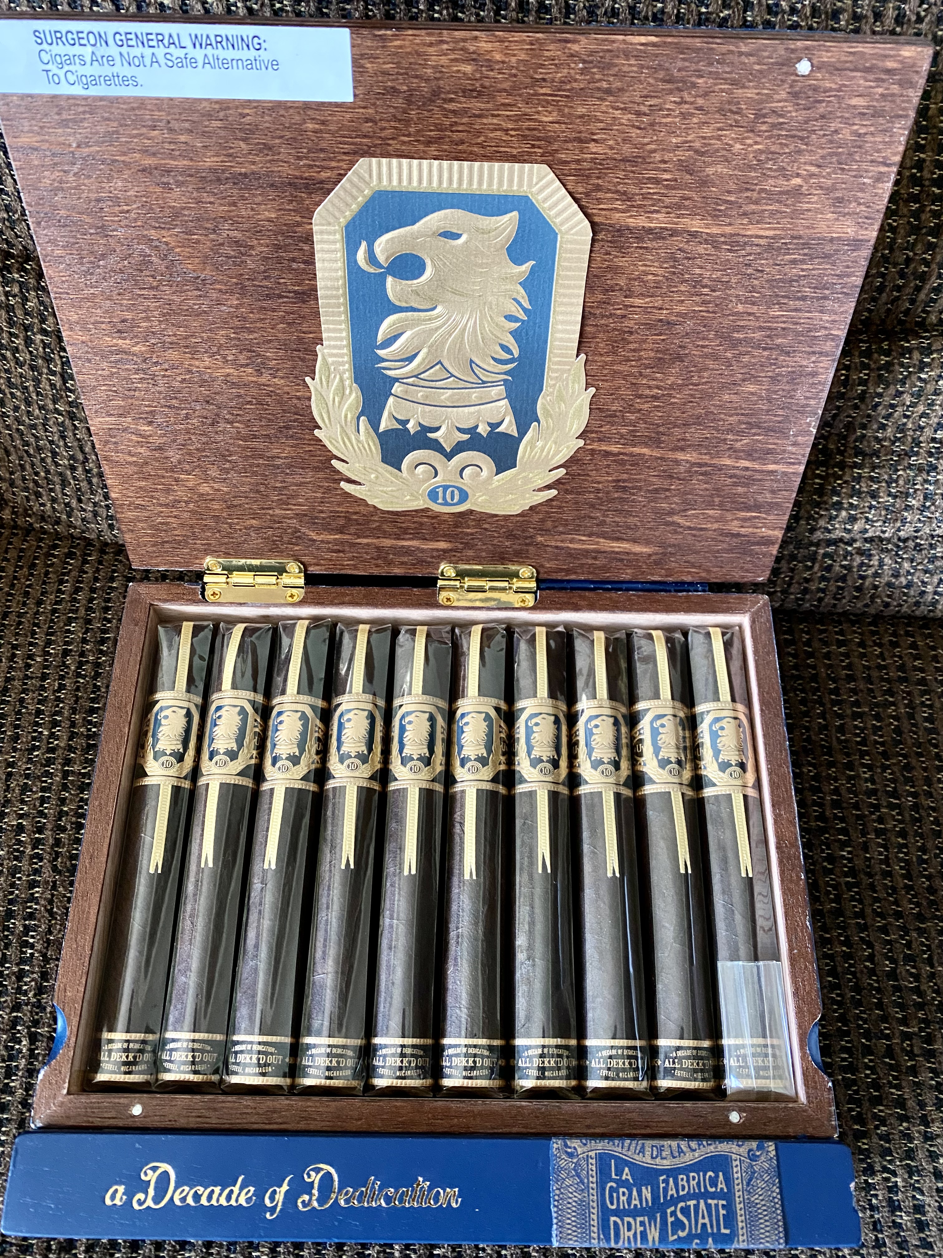 A full-bodied cigar that offers notes of chocolate, sweetness, earth, wood, and pepper. Its Mexican San Andres maduro wrapper sheaths a USA Connecticut Broadleaf binder and a Nicaraguan filler. The Liga Undercrown 10 celebrates “A Decade of Dedication,” and marks this ultra-popular brand’s tenth anniversary. Once rolled the cigars are “All Dekked Out” with a special ribbon, band, and foot band to commemorate its milestone birth year. The cigars are tucked inside a commemorative collectible box. The cigars are handmade in Nicaragua.