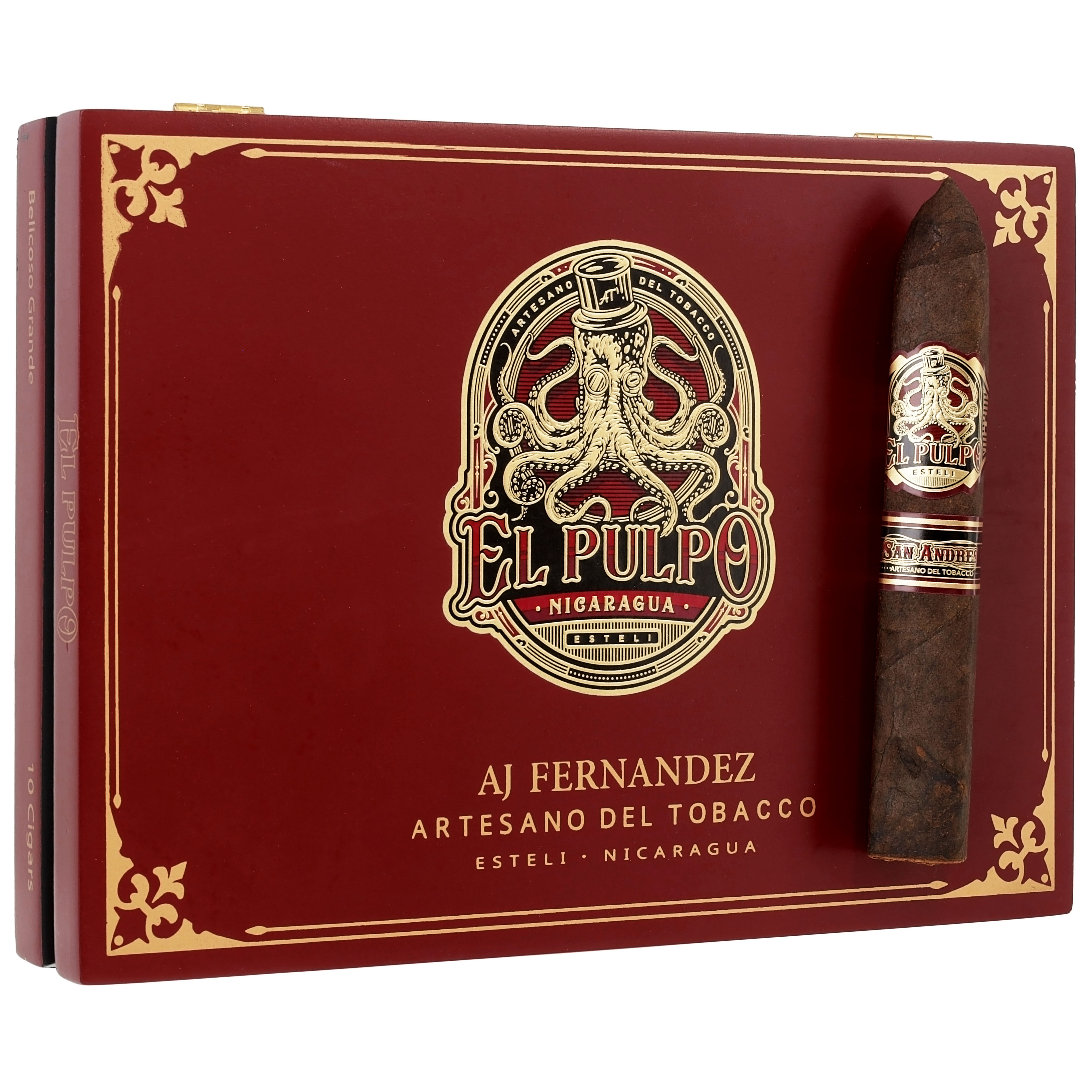 A potent yet smooth cigar with a rich earthiness, touches of cocoa, spice, and an overall meatiness. Its rustic Mexican San Andres maduro wrapper cloaks a Nicaraguan binder and filler. Handmade in Nicaragua, at AJ Fernandez’s San Lotano factory. “El Pulpo” is Spanish for “the octopus.” And like its namesake, the El Pulpo by Artesano del Tobacco will envelop your palate with its rich complexity and unique retro-hale and never let you go. So, be sure to buy a box or two. The El Pulpo by Artesano del Tobacco Belicoso Grande Box-Pressed received the #10 spot in the Top 25 Cigars of 2023 by Cigar Aficionado and a 94 rating.