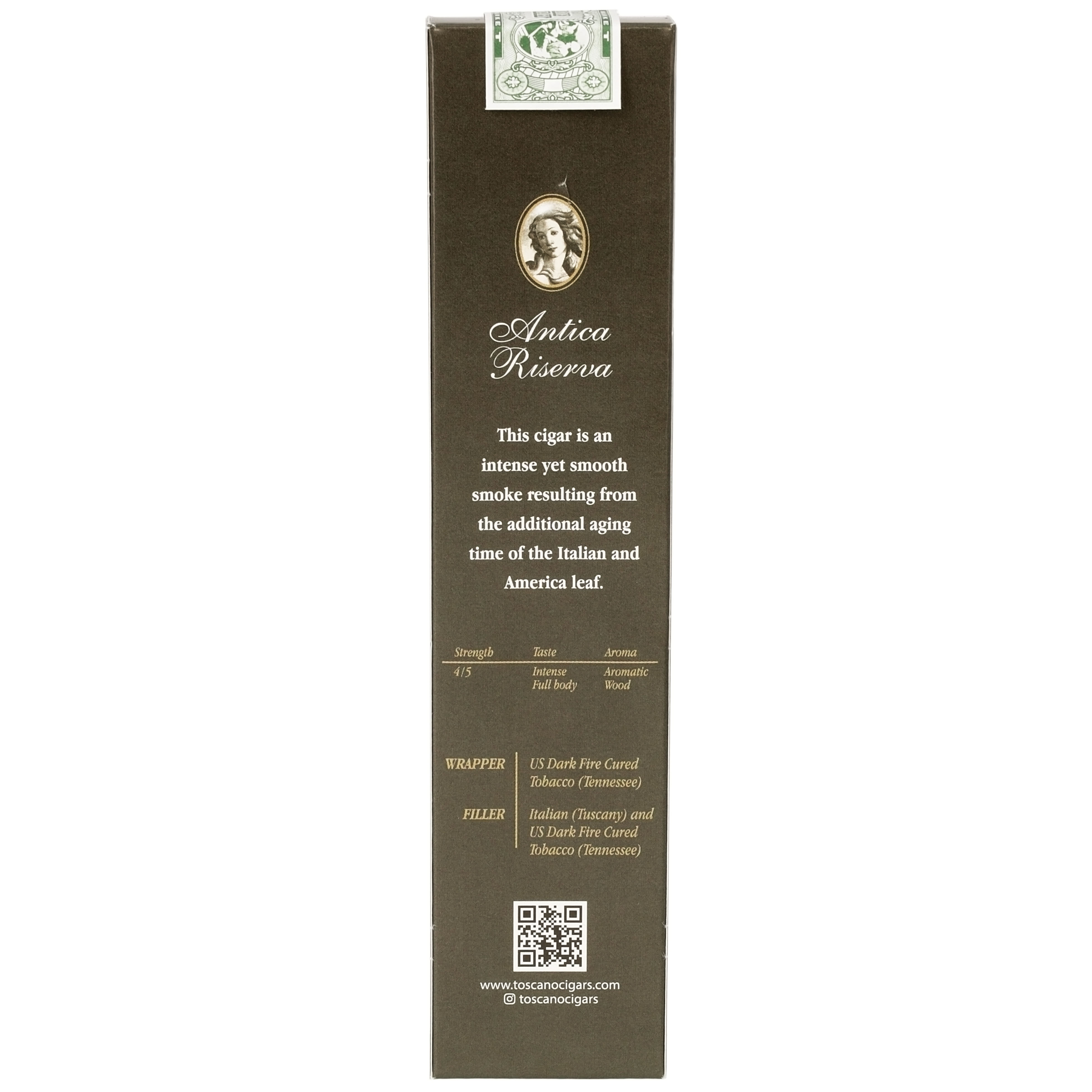 A full-bodied smoke, the Toscano Antica Riserva is a slim panatela that is machine made in Italy. Its USA Kentucky wrapper is draped over a filler made of Italian and Kentucky tobaccos that have been aged for 12 months. From first puff to last, the Toscano Antica Riserva has a pleasing woodsy and fruity flavor that is accompanied by a warm tobacco aroma.