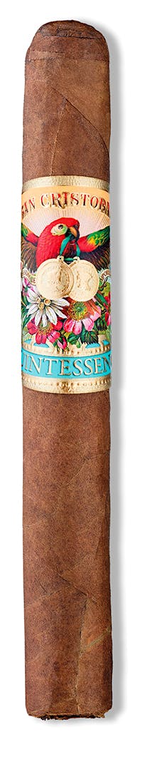 San Cristobal Quintessence is one of five versions of the San Cristobal brand, a line of cigars made in Nicaragua by the Garcia family for Ashton Distributors Inc. What makes this different from the rest is the wrapper—a high-priming leaf of Ecuadoran Habano. It's lighter than the oscuro wrappers found on the core line. The rest of the tobaccos were grown on the Garcia's farms in Nicaragua. The Corona Gorda is the newest size in the line, and it has an impressive combination of balance and character. It's a leathery and spicy cigar but well layered with sweet notes of chocolate. The construction is remarkably good, and while the trend for cigars seems to be going thicker, Ashton took the corona gorda in the opposite direction.