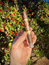 An invigorating yet balanced smoke with notes of sweetness, vanilla and spice. This all-Dominican puro sports a delicious dark chocolatey maduro wrapper that has been specially fermented and aged. The tobacco used to make this memorable stick is grown at Chateau Fuente. The Arturo Fuente Opus X OXO Oro Oscuro Perfecxion #4 is handmade in the Dominican Republic. Due to very limited availability, only a maximum of 3 cigars will be sold per customer, no exceptions.