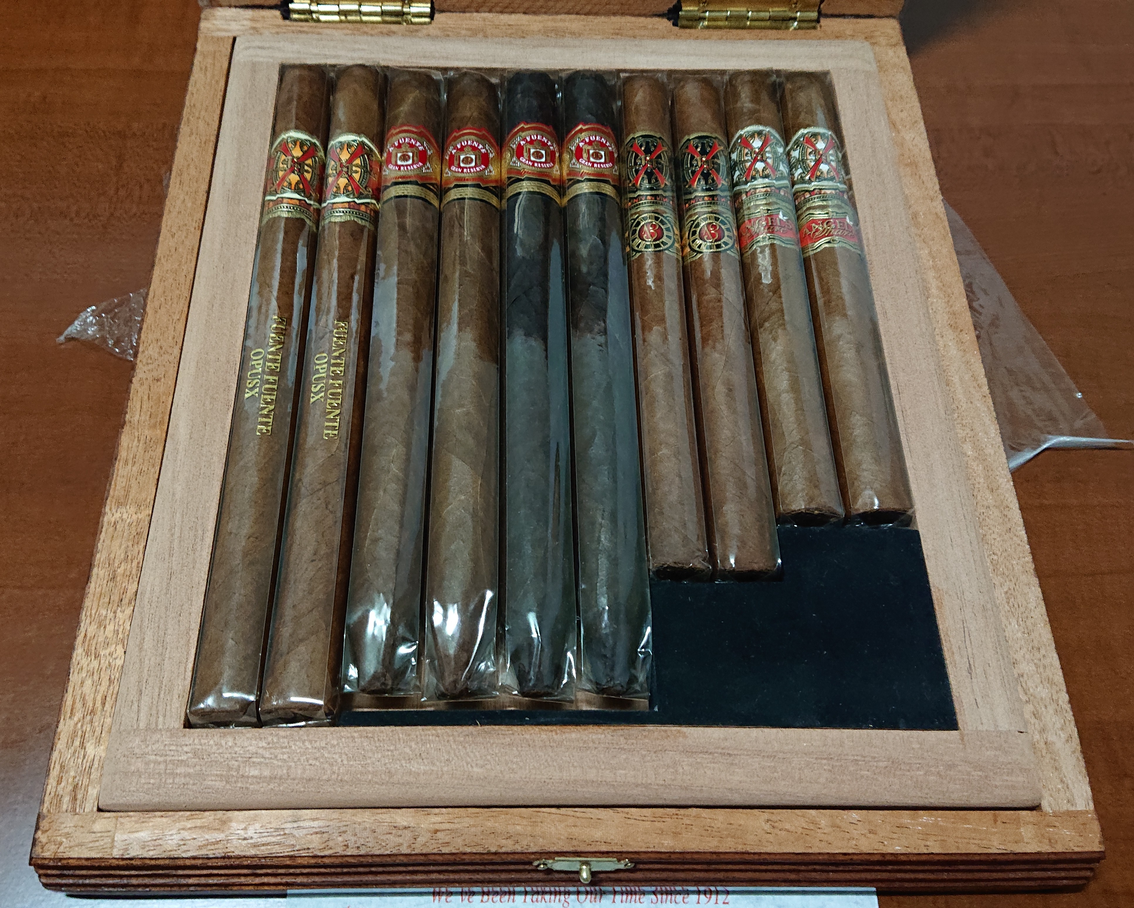 The Big Papo sampler by Arturo Fuente contains 10 hard-to-find cigars by this famed manufacturer: 2 Opus X Perfecxion A, 2 Hemingway Masterpiece Natural, 2 Hemingway Masterpiece Maduro, 2 Opus X TAA Torch Bearer, and 2 Opus X Angel's Share Reserva d'Chateau.