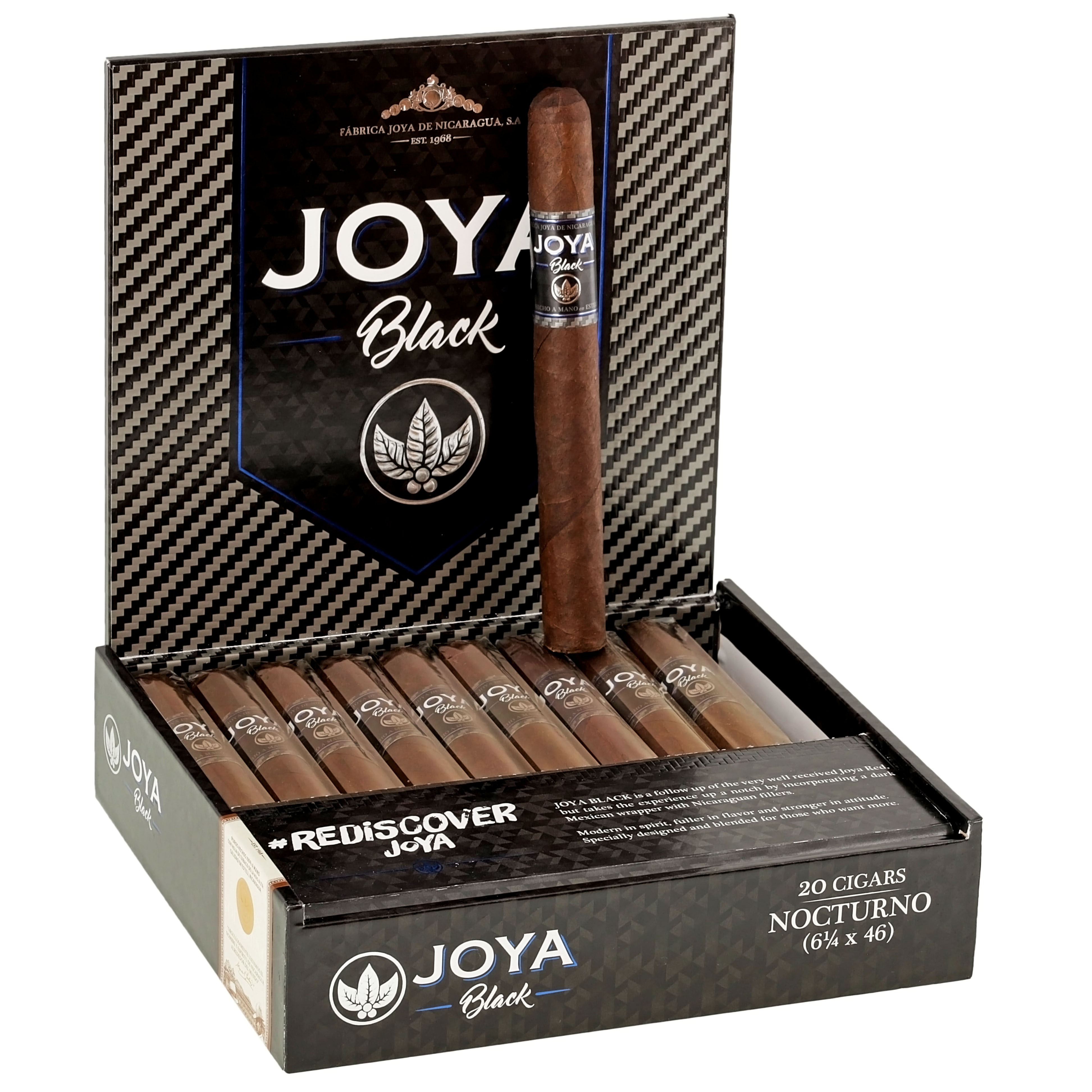 A medium to full-bodied cigar that delivers notes of pepper, leather, espresso, and cocoa. Its oily Mexican San Andres maduro wrapper drapes a Nicaraguan binder and filler. Handmade in Nicaragua by Drew Estate, the Joya Black offers a potent smoking experience that will appeal to seasoned aficionados.