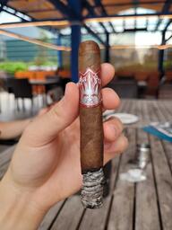 This medium-strength cigar employs a sweetened cap and a delicate infusion of coffee to create a relaxing, mellow aroma. It features a bold, dark wrapper of undisclosed origin with a Nicaraguan binder and filler. The cigars are handmade in Nicaragua.