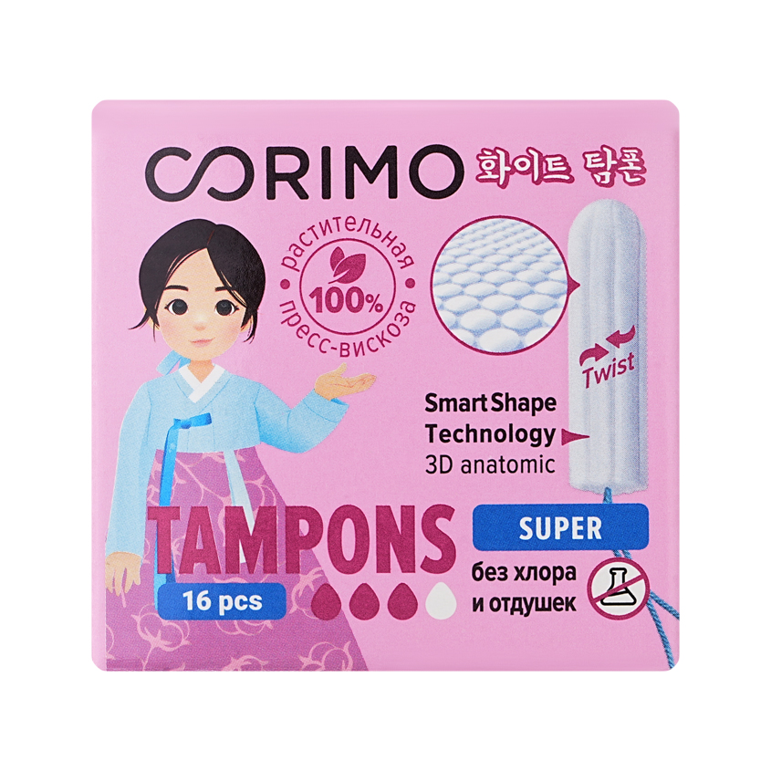 Современные и технологичные тампоны Corimo разработаны совместно с лабораторией в Южной Корее. Впитывающая основа тампонов выполнена из вискозы фармацевтического качества 100% растительного происхождения. Такой абсорбент впитывает лучше и быстрее, чем хлопок. Не вызывает раздражения и аллергических реакций при соблюдении рекомендаций по использованию.