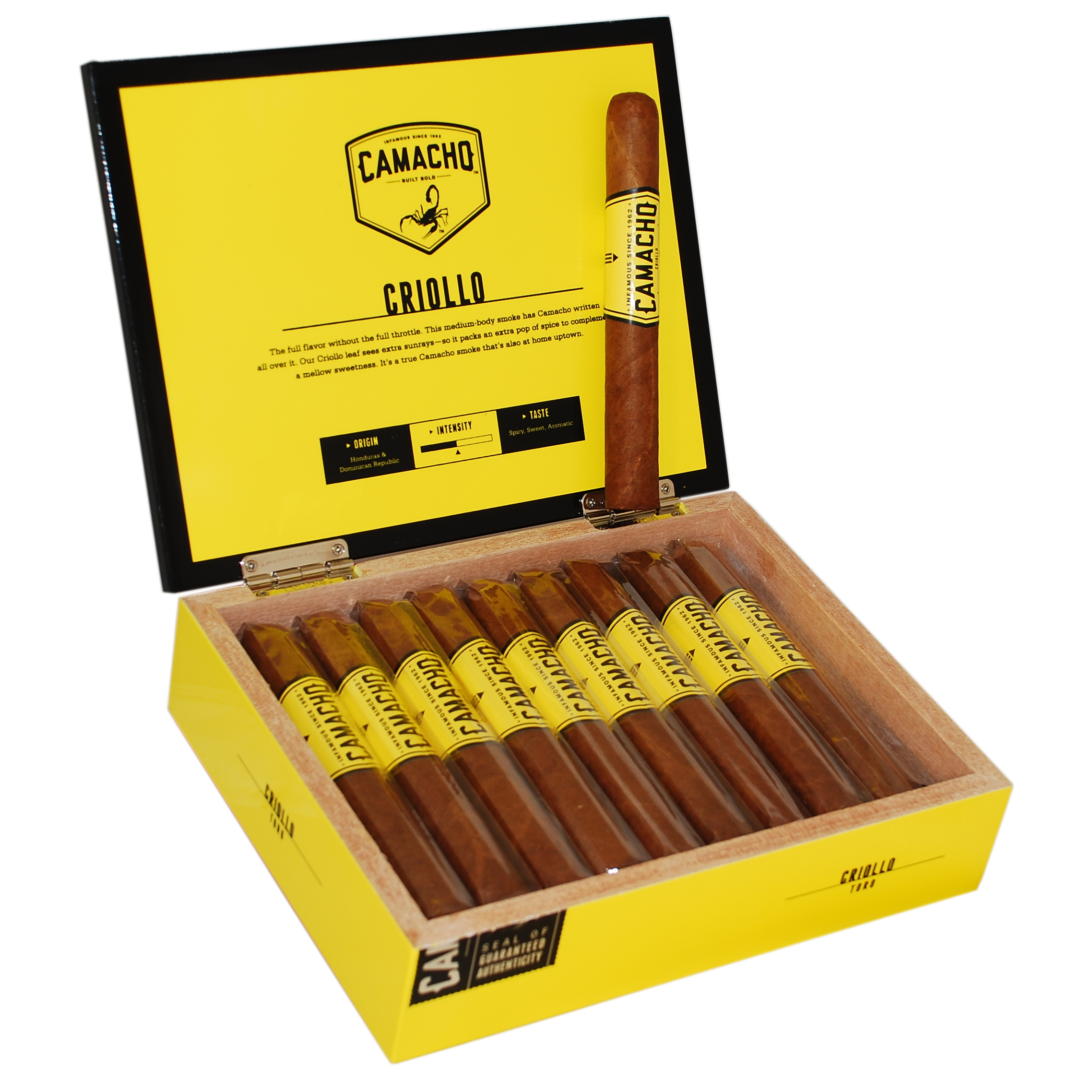 The Camacho Criollo cigar is handmade in Honduras with a Honduran wrapper and binder, and fillers from Honduras and the Dominican Republic. The Camacho Criollo Toro delivers spice on the first few puffs, mellowing down to some earthy, nutty medium bodied flavors. A more mellow cigar within the Camacho brand.