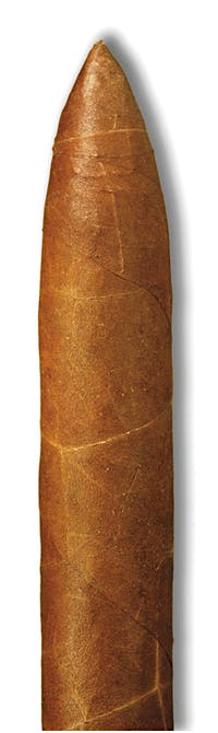 A pointy torpedo that maintains an even draw and crooked burn throughout. The smoke begins herbal and toasty, picking up intensity with sweet black licorice flavor.