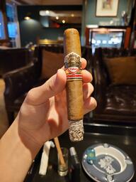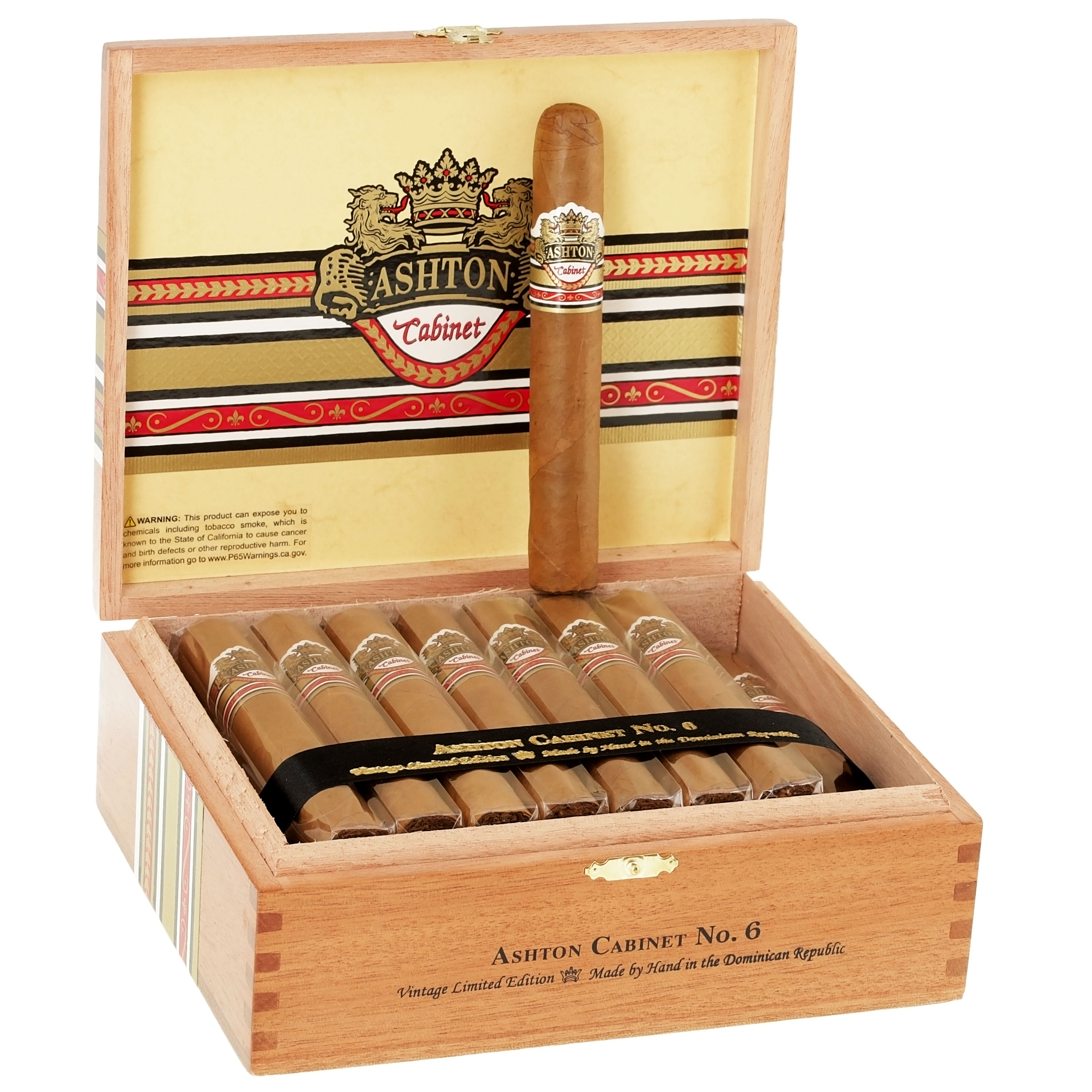 A complex and well-rounded cigar with notes of nuts, cedar and floral. Its 4 to 5 year old Dominican filler is covered by a Connecticut wrapper that is aged one extra year. The Ashton Cabinet No, 6 is handmade in the Dominican Republic at Chateau de la Fuente.