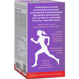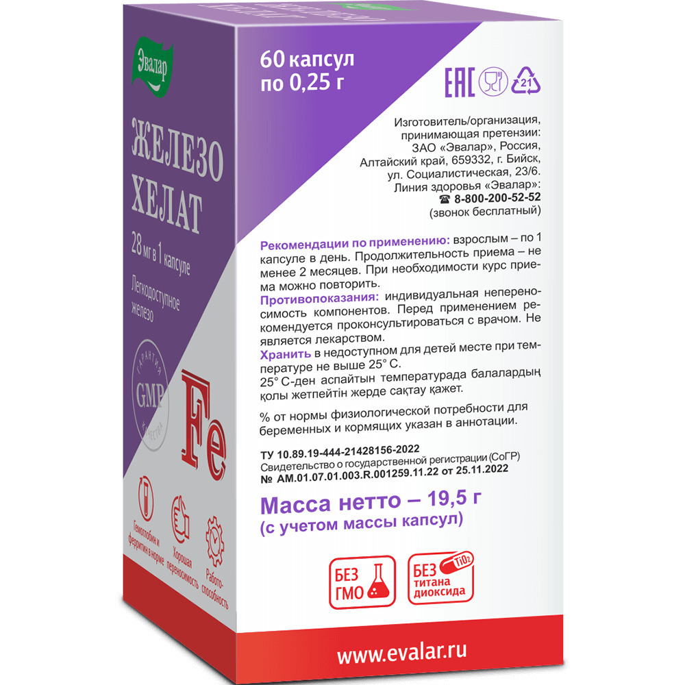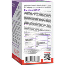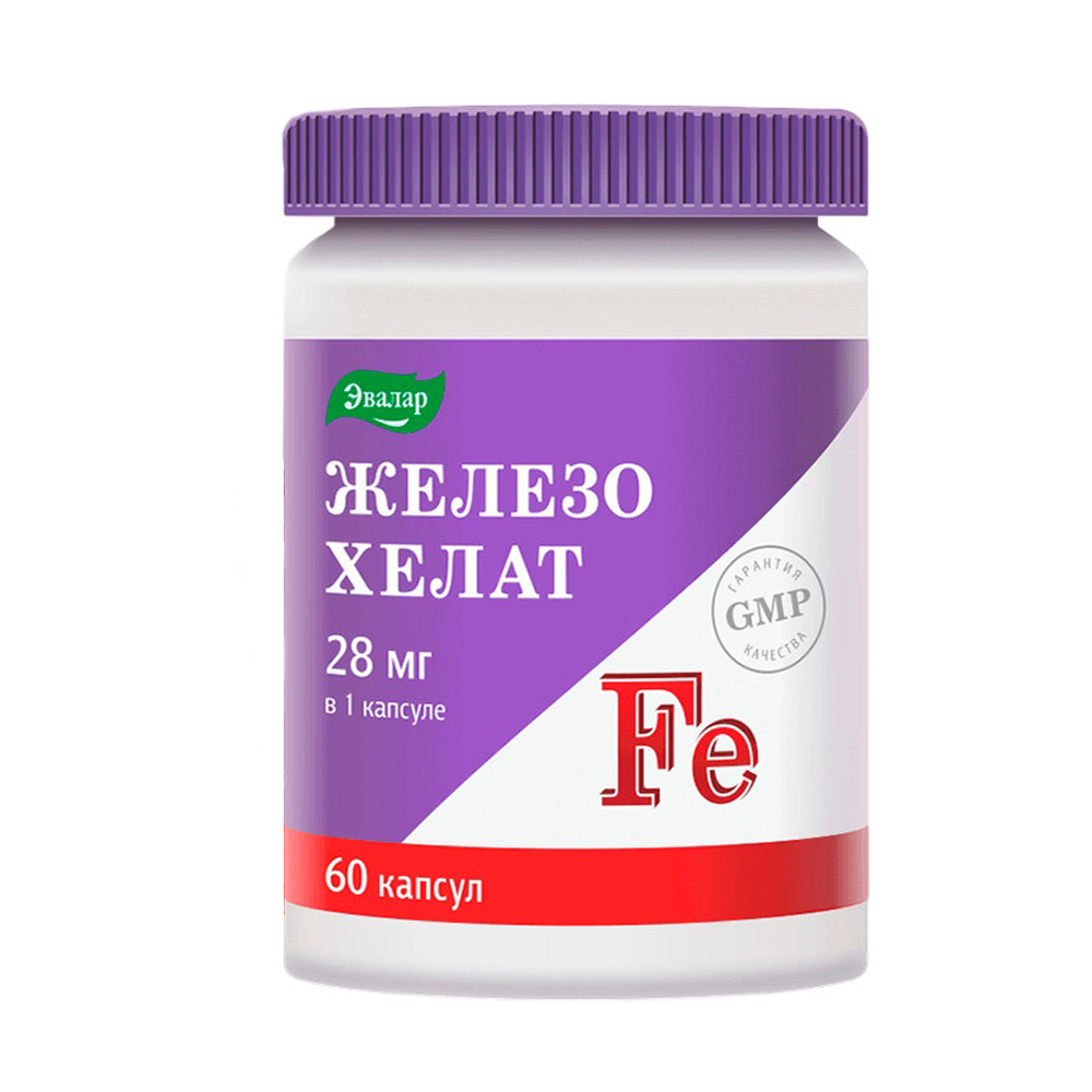 Железо Хелат – высокоэффективная добавка с хелатной формой железа (бисглицинат), которая усваивается на 90% и не вызывает побочных эффектов со стороны ЖКТ. В составе – усиливающие действие витамины С, В12 и фолиевая кислота.<br>