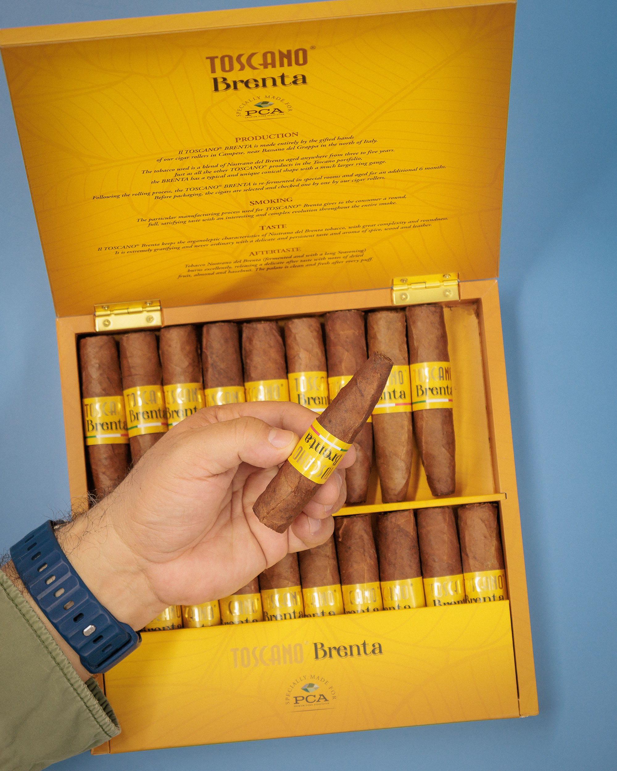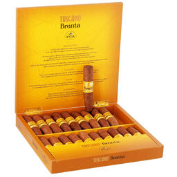 Warm walnut and hazelnut notes accompanied by hints of wood and a spicy, woody, and floral aroma provide this mild to medium strength cigar’s deep complexity. The Brenta’s blend is made entirely of Havana Dark Air Cured tobacco that has been aged 3 – 5 years. This is the first time Toscano has released a cigar that has been air cured, which allows the tobacco to lose its humidity and chlorophyll naturally and provides more of the cigar’s natural flavors and aromas. Once rolled, the cigars are re-fermented in climate control rooms and allowed to age for six months. This meticulous aging process lets the flavors fully develop providing you with a delightfully satisfying smoking experience. The Toscana Brenta pairs well with rum or whiskey. The cigars are handmade in Italy. This is a PCA (Premium Cigar Association) exclusive. Available only through PCA member retailers such as Neptune Cigars.