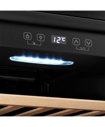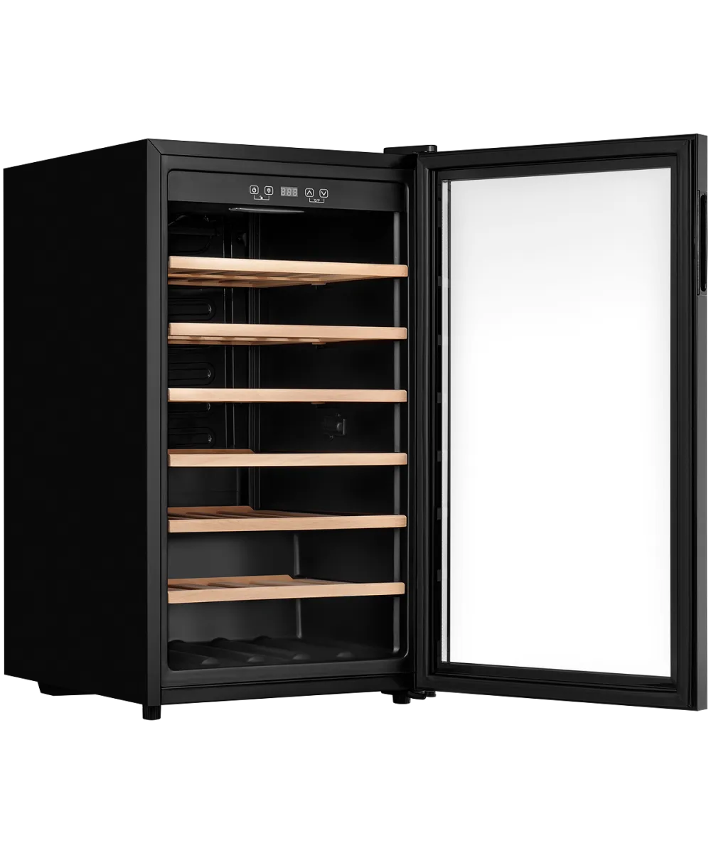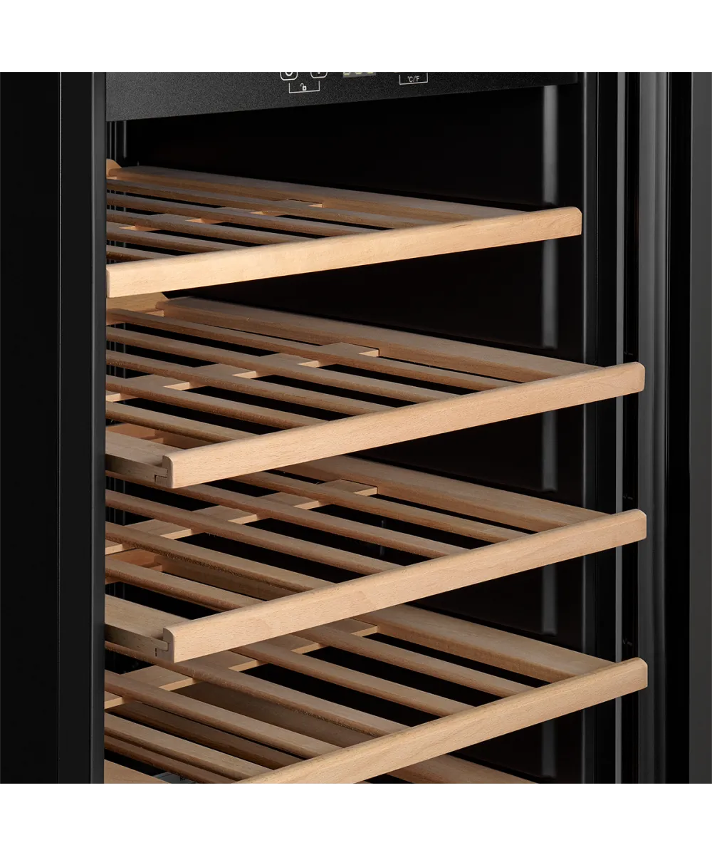 Шкаф оснащён шестью полками из натурального бука, которые обеспечивают надёжное размещение бутылок. Механическое открытие двери делает использование максимально удобным.