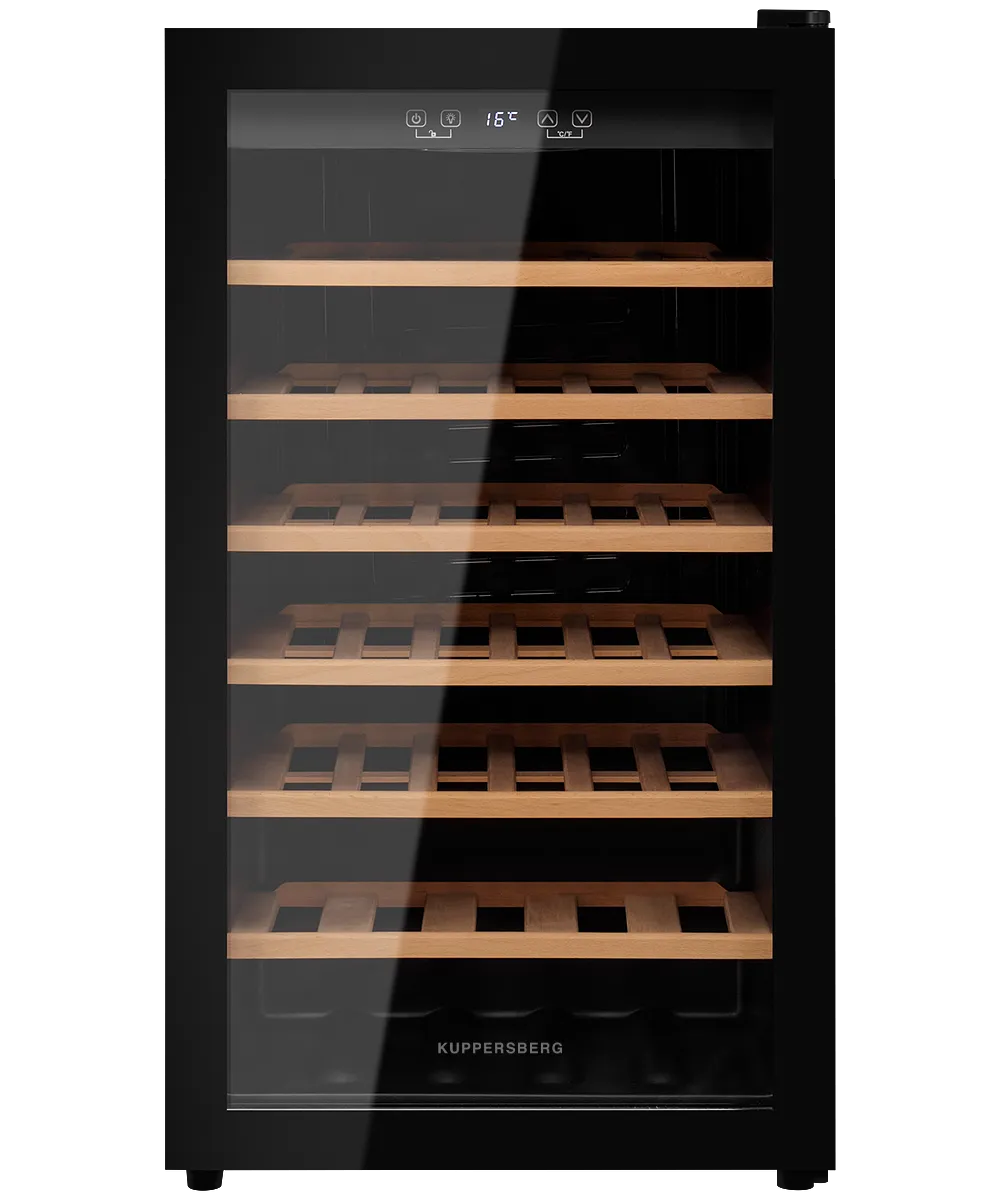 Винный шкаф KUPPERSBERG/ Винный шкаф KUPPERSBERG, отдельностоящий, High-Tech, объем 128 л, вместимость 40 бутылок, диапазон температуры 5-20 градусов, механическое открытие двери, 6 полок из бука, LCD дисплей, уровень шума 38 дБ, цвет черный