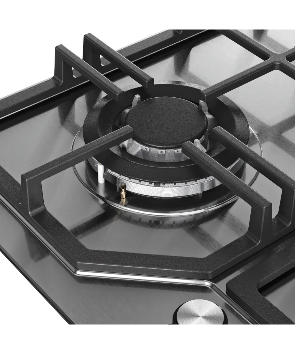 Поверхность выполнена из высококачественной нержавеющей стали, устойчивой к механическим повреждениям и лёгкой в уходе. Сочетание материалов и продуманный дизайн делают варочную панель стильным элементом кухонного интерьера.