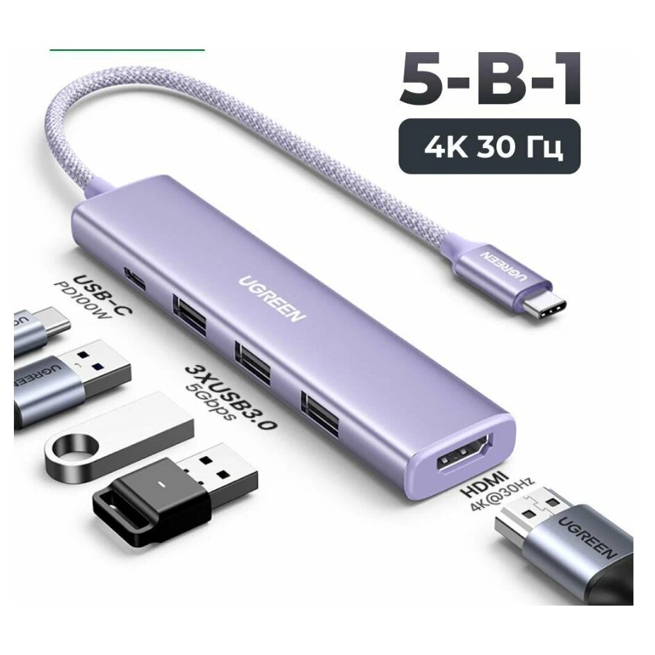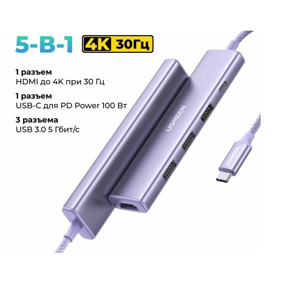 Конвертер UGREEN CM478 (35582) USB-C To HDMI 4K 32Hz+3*USB 3.0 A+PD Power Converter Creamy Purple