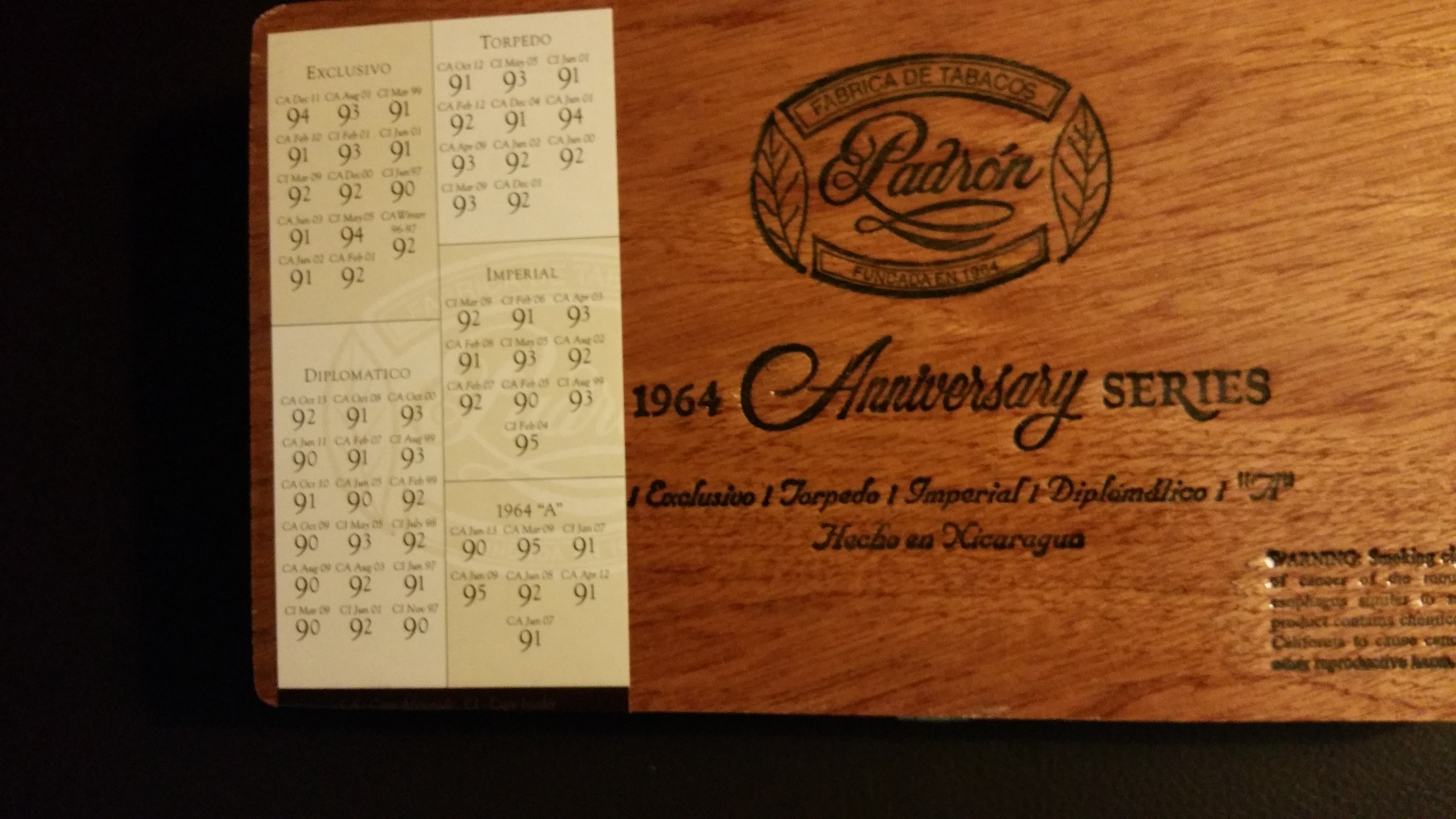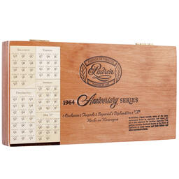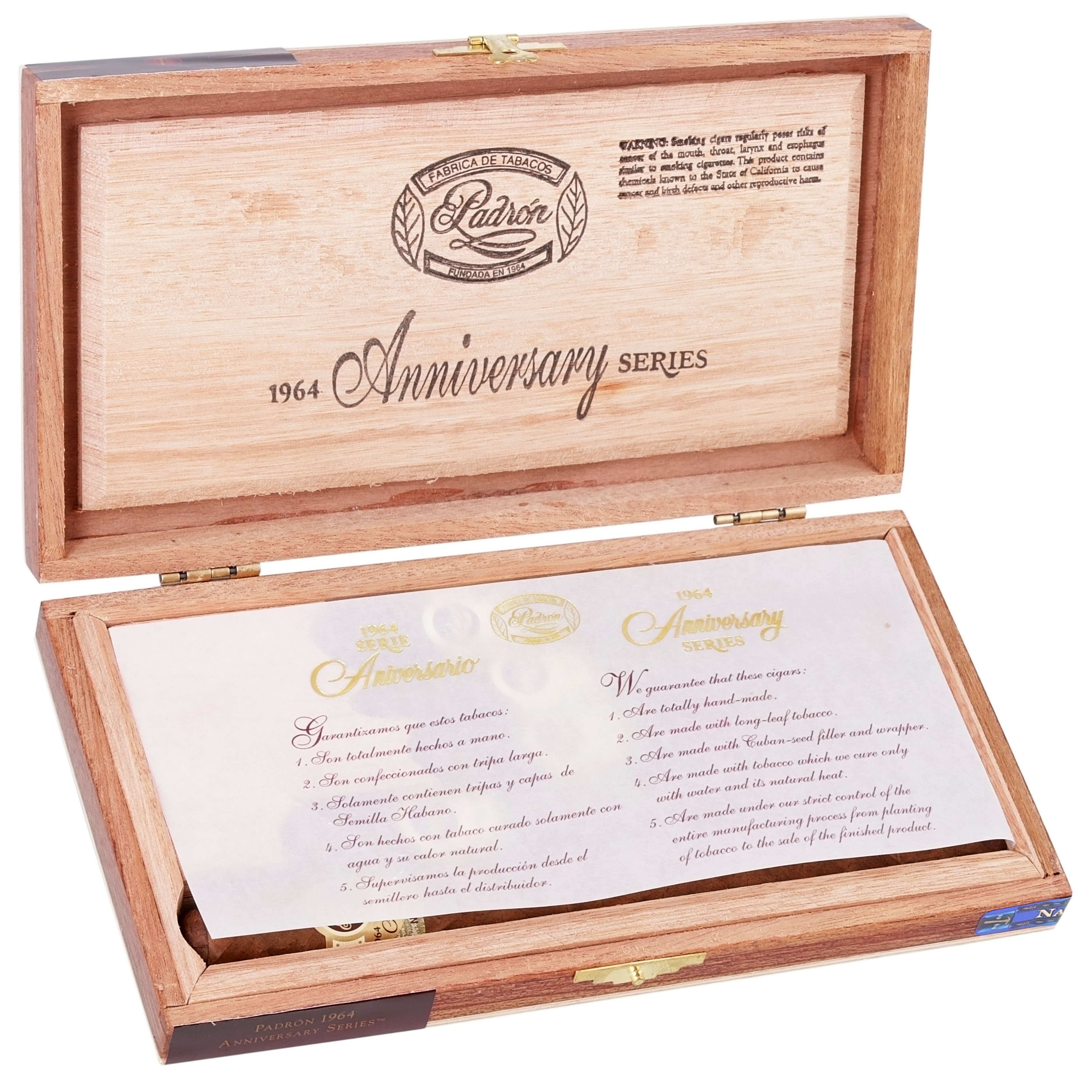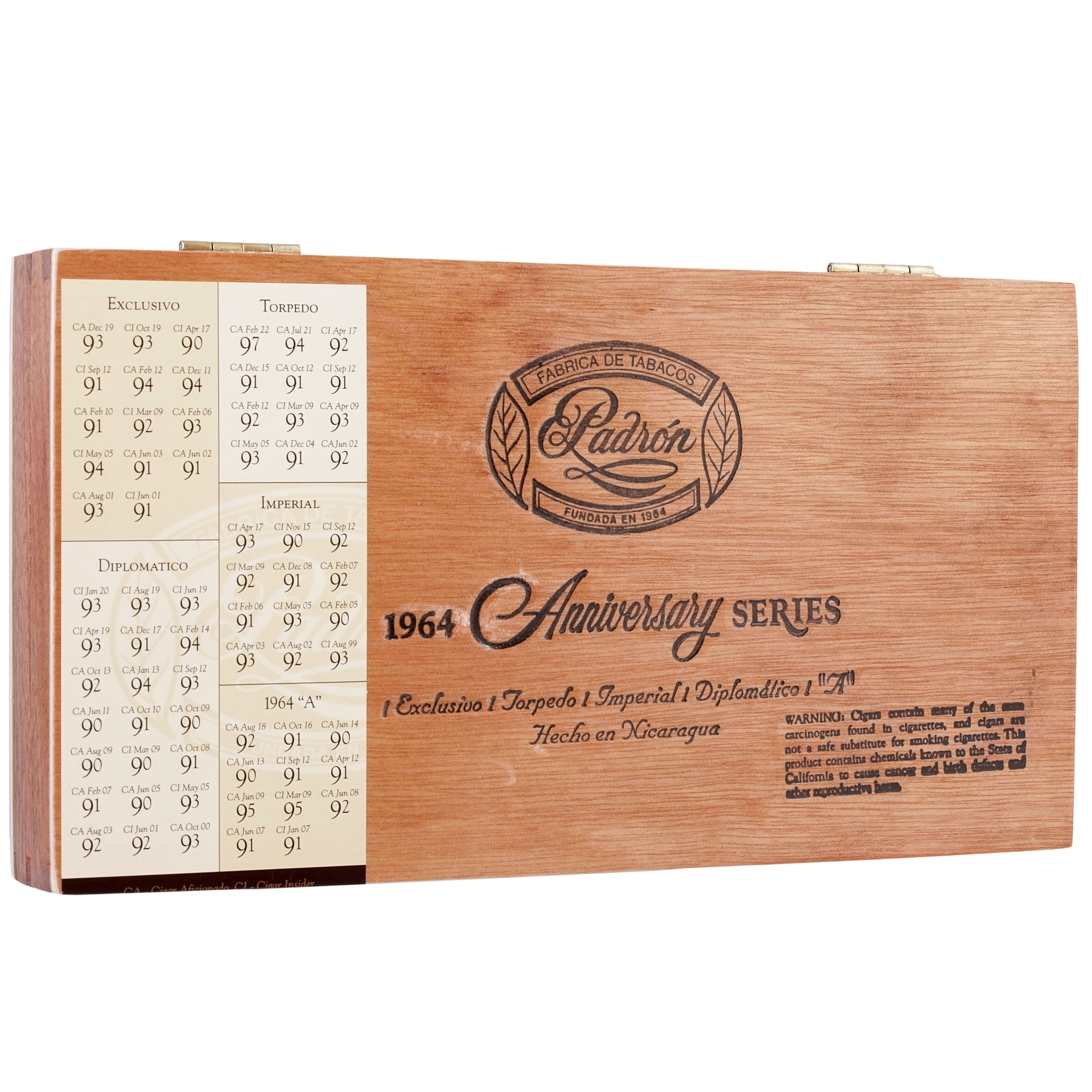 Five great cigars now come in a beautiful wooden gift box. The sampler includes five Padron 1964 Anniversary Natural cigars: 1 "A" Natural 8"1/4 x 50, 1 Diplomatico Natural 7"*50, 1 Exclusivo Natural 5"1/2 x 50, 1 Imperial Natural 6" x 54, 1 Torpedo Natural 6" x 52.