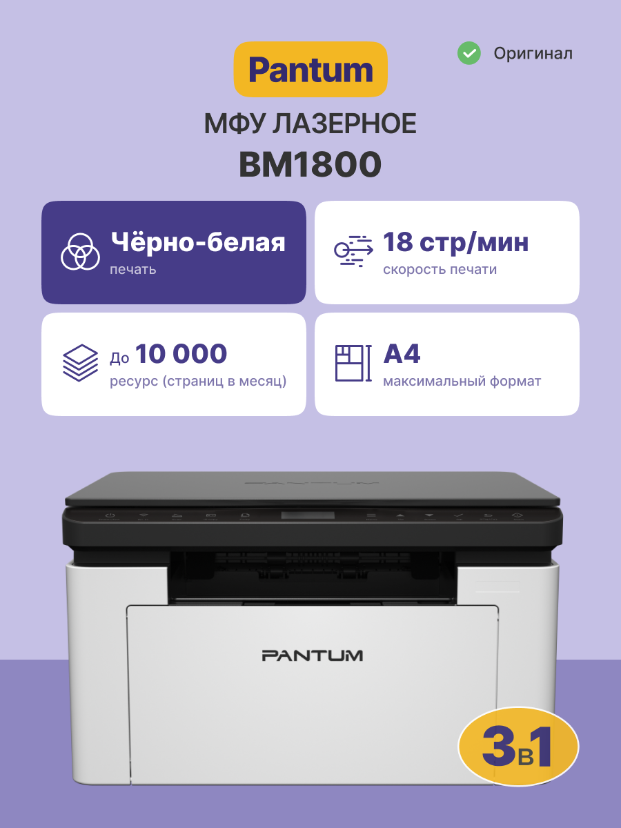 Монохромное МФУ Pantum BM1800 - это надёжное и компактное устройство формата A4 в строгом белом корпусе, которое подойдёт как для домашнего использования, так и для небольшого офиса. Минималистичный дизайн без лишних деталей органично впишется в любой интерьер.