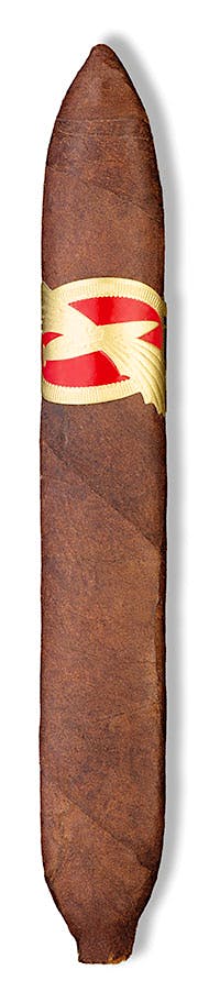 Gleaming with a reddish tinge, this box-pressed perfecto burns evenly. Early acidity dissipates to show a warm, toasty character, rich with hazelnut and chocolate accented by pops of orange oil and espresso.