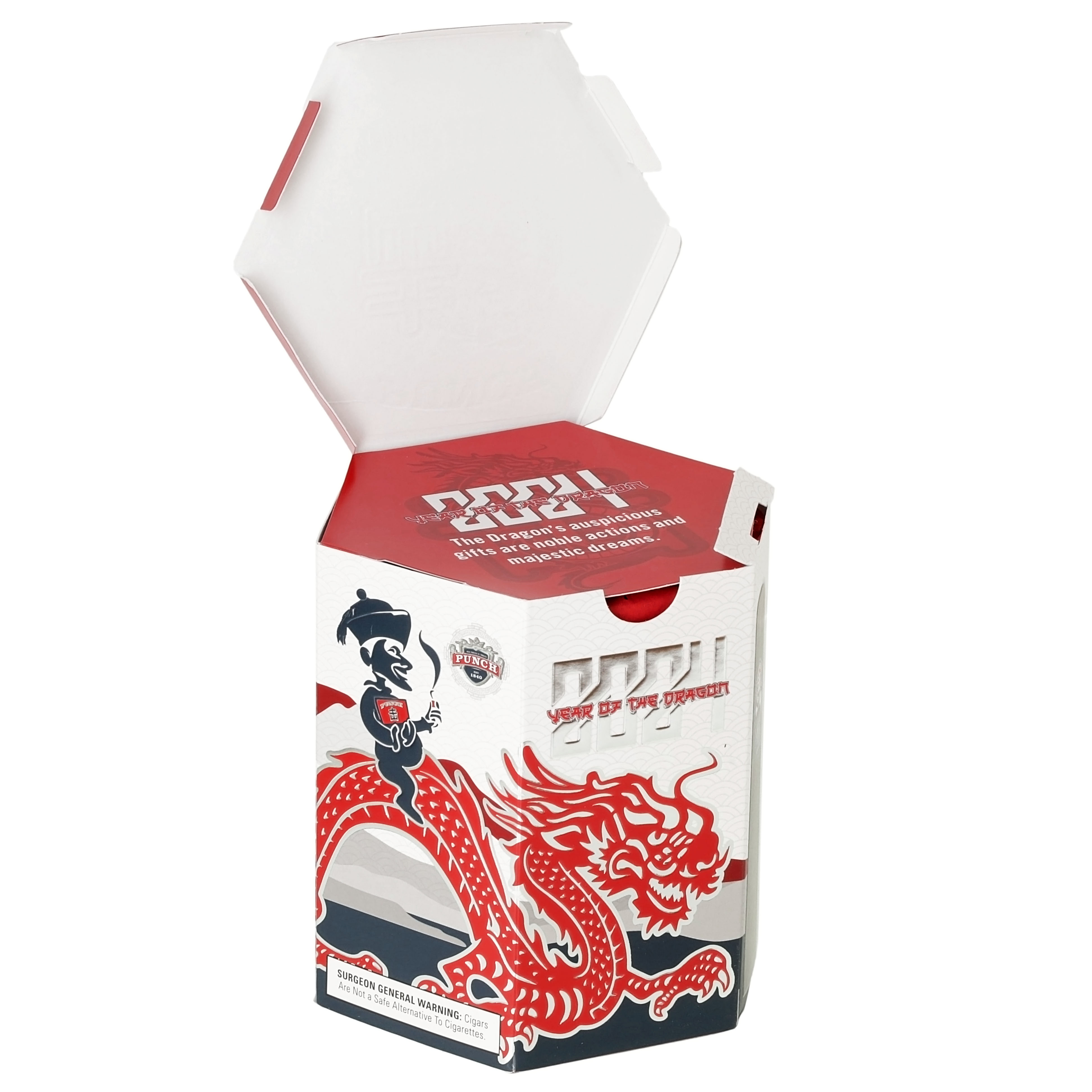 A potent and flavorful firecracker of a cigar that explodes with peppery, earthy, coffee, and cocoa notes. Its muscular Mexican maduro wrapper cloaks a Nicaraguan binder and a filler composed of Dominican Piloto Cubano, Honduran, and Nicaraguan leaves. The cigars are handmade in Nicaragua. It pairs well with coffee, tequila, and port wine. The Punch Dragon Fire is the sixth installment of Punch’s limited edition cigars that celebrate the Chinese New Year (aka the Lunar New Year). The cigars come in a collectible box that resembles a box of fireworks.