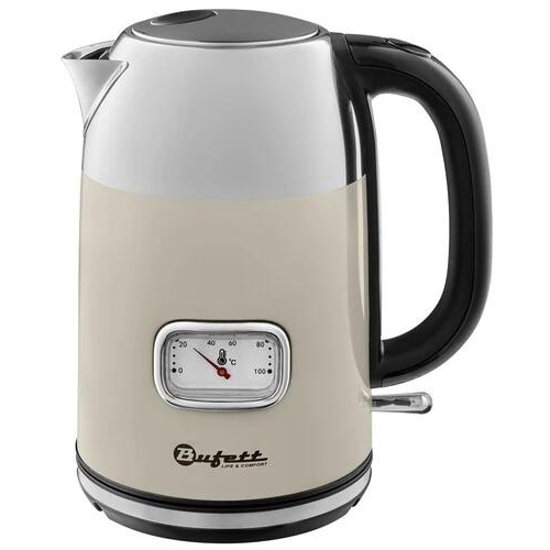 Электрический чайник объемом 1,7 литра Bufett - это стильная модель с расширенным функционалом. Имеющийся на корпусе термометр в режиме реального времени отображает текущую температуру нагрева жидкости. В чайнике предусмотрена ручка с защитой от нагрева, резервуар сделан из нержавеющей стали.