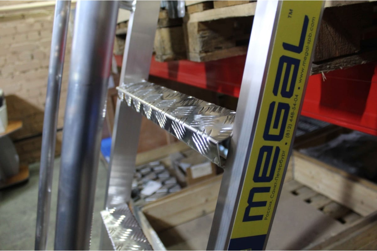 Удобные ступени из рифленого листа квинтет обеспечивают комфортный подъем и спуск. Для безопасности снизу модель оснащена резиновыми противоскользящими башмаками и поручнями по бокам.