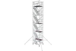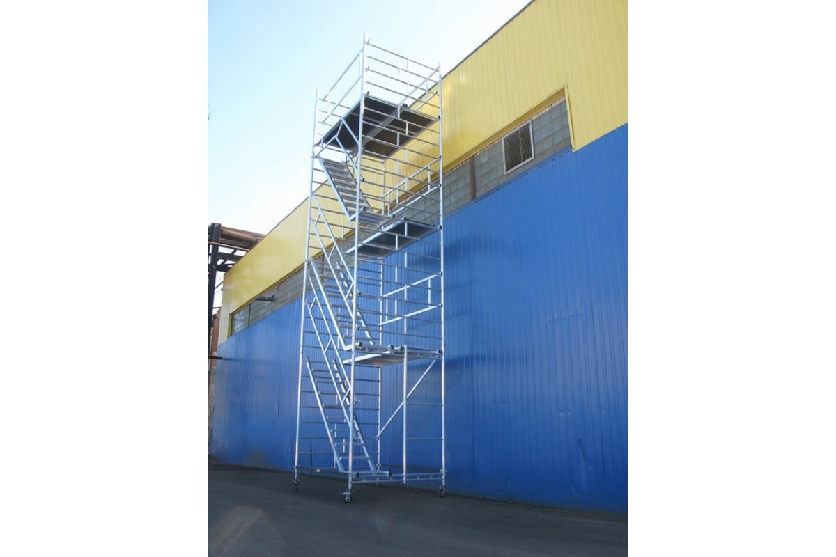 Модульная алюминиевая вышка MEGAL ВМА 1400Л/11 101461 обеспечивает подъем и организацию рабочего места на высоте с использованием лестничных маршей в строительно-монтажных, ремонтных и прочих работах.
