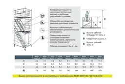 Вышки габаритной высотой 7 метров и более оснащены консолями-стабилизаторами (4 шт.). Монтируются на компактном основании из стальных стяжек. Все вышки оснащены поворотными колесами со стопорами. Вышки дополнительно регулируются по высоте в рамках длины винтовой опоры.