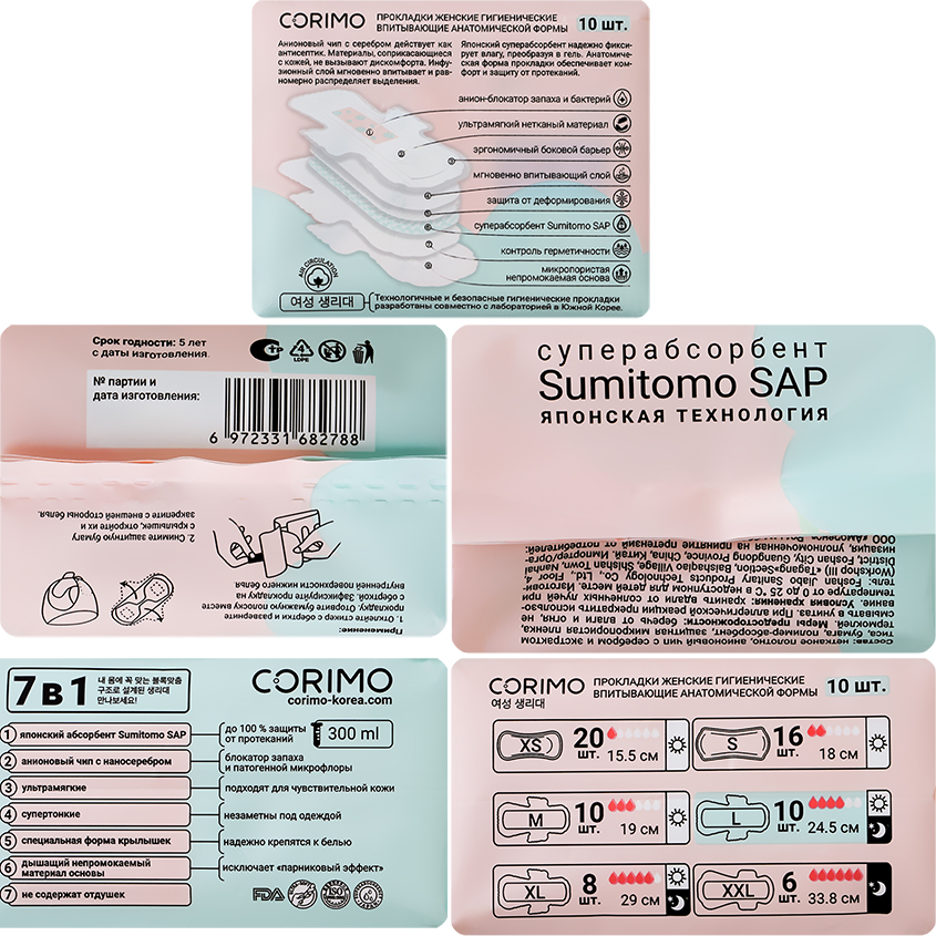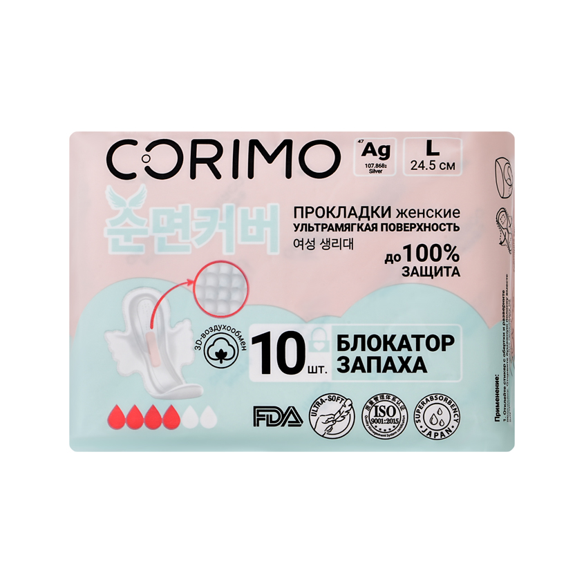 Технологичные и безопасные женские прокладки CORIMO разработаны совместно с лабораторией в Южной Корее. Прокладки обладают антибактериальными свойствами, благодаря анионовому чипу с наносеребром и экстрактом тиса, который препятствует размножению бактерий и возникновению запаха. Экстра мягкий верхний слой из нежного нетканого материала без химических пропиток не вызывает раздражений и содержит отверстия в виде воронки. Через них влага быстро поникает внутрь прокладки и блокируется там. Главным преимуществом прокладок Corimo является японский суперабсорбент Sumitomo SAP, который превращает влагу в гель и способен впитать в 30 раз больше своего веса. Для свободной циркуляции воздуха и профилактики размножения патогенной микрофлоры непромокаемая дышащая основа выполнена из микропористого материала, который исключает образование парникового эффекта.