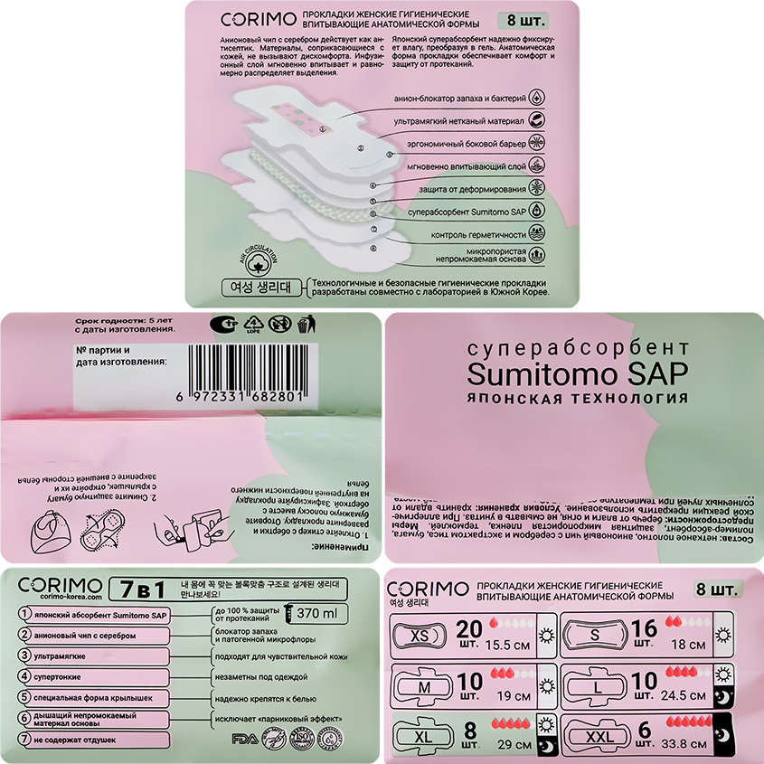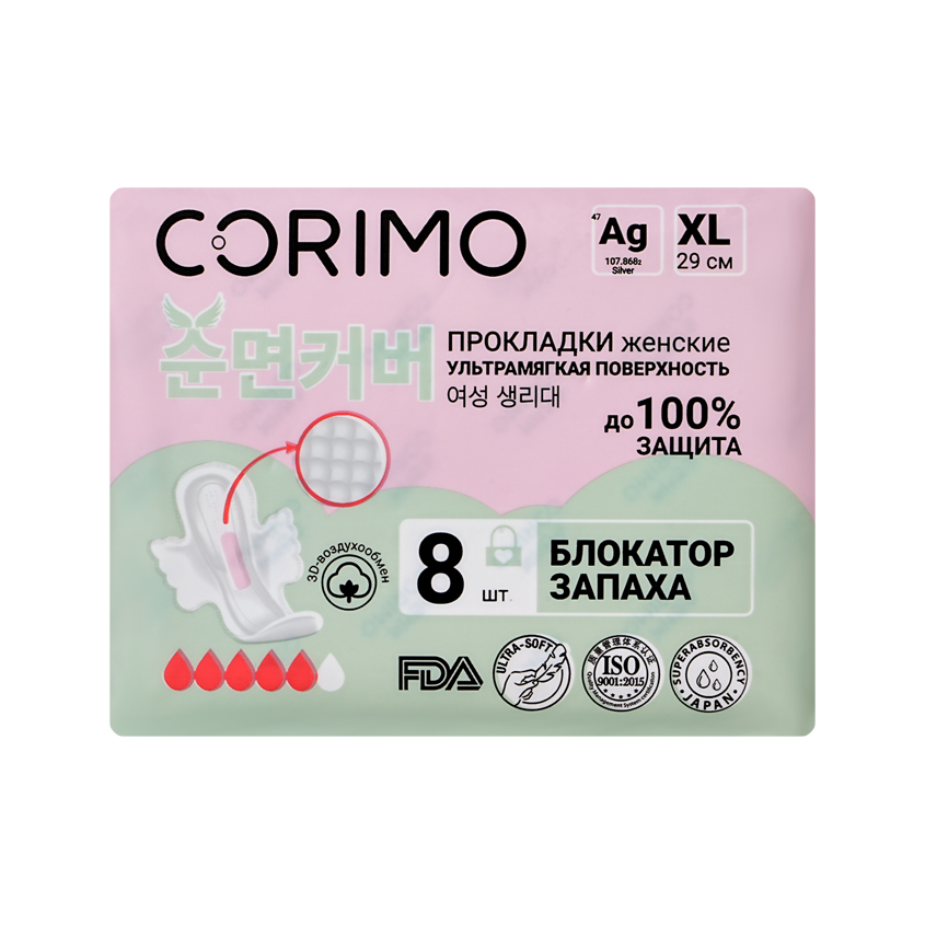 Технологичные и безопасные женские прокладки CORIMO разработаны совместно с лабораторией в Южной Корее. Прокладки обладают антибактериальными свойствами, благодаря анионовому чипу с наносеребром и экстрактом тиса, который препятствует размножению бактерий и возникновению запаха. Экстра мягкий верхний слой из нежного нетканого материала без химических пропиток не вызывает раздражений и содержит отверстия в виде воронки. Через них влага быстро поникает внутрь прокладки и блокируется там. Главным преимуществом прокладок Corimo является японский суперабсорбент Sumitomo SAP, который превращает влагу в гель и способен впитать в 30 раз больше своего веса. Для свободной циркуляции воздуха и профилактики размножения патогенной микрофлоры непромокаемая дышащая основа выполнена из микропористого материала, который исключает образование парникового эффекта.